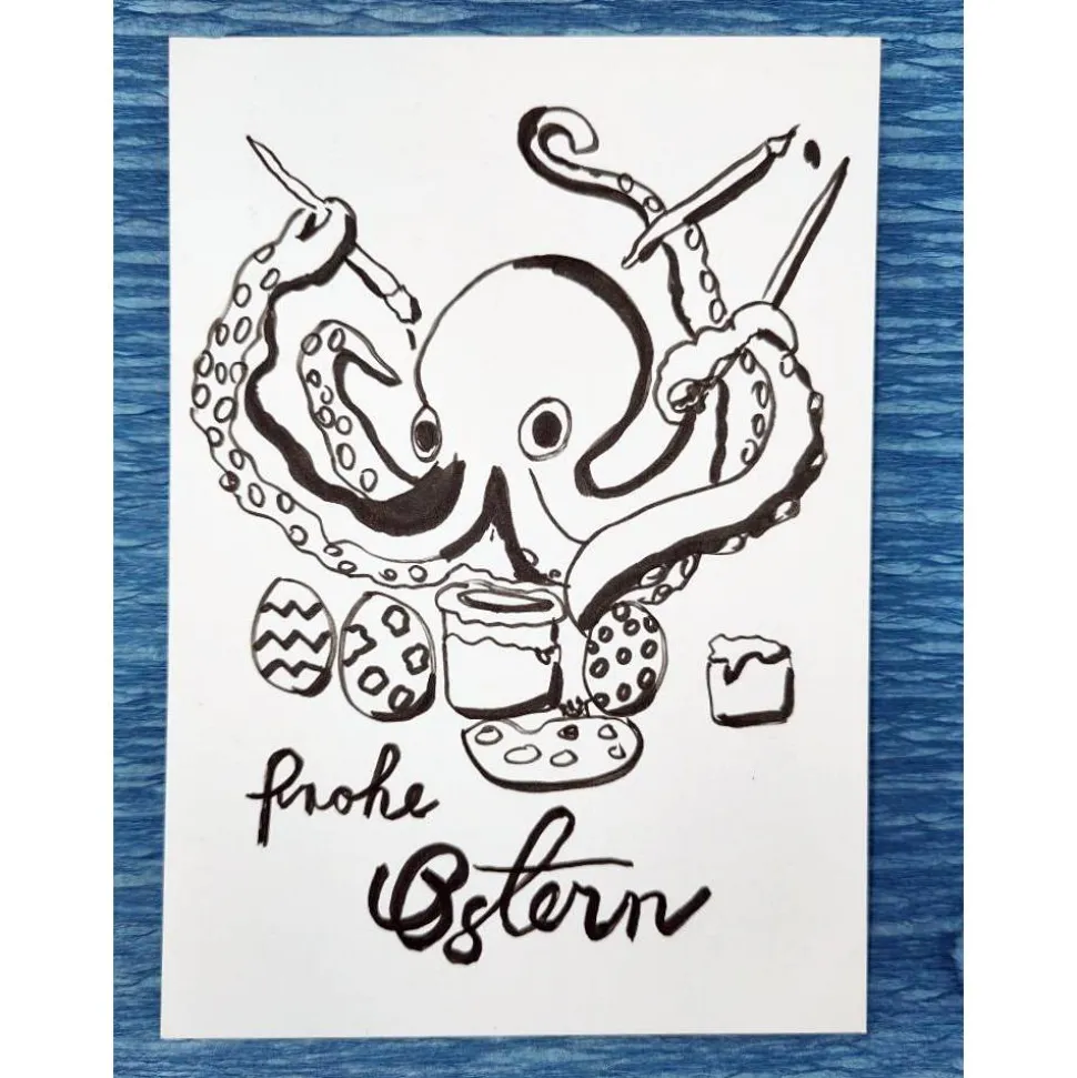 Dieser krakenmäßige Künstler hat’s drauf: Eier bemalen, Schleifchen binden, Schoko naschen – und das alles gleichzeitig! Eine Hommage an alle Multitasker*innen, die sich nie aus der Ruhe bringen lassen, auch wenn’s mal drunter und drüber geht.