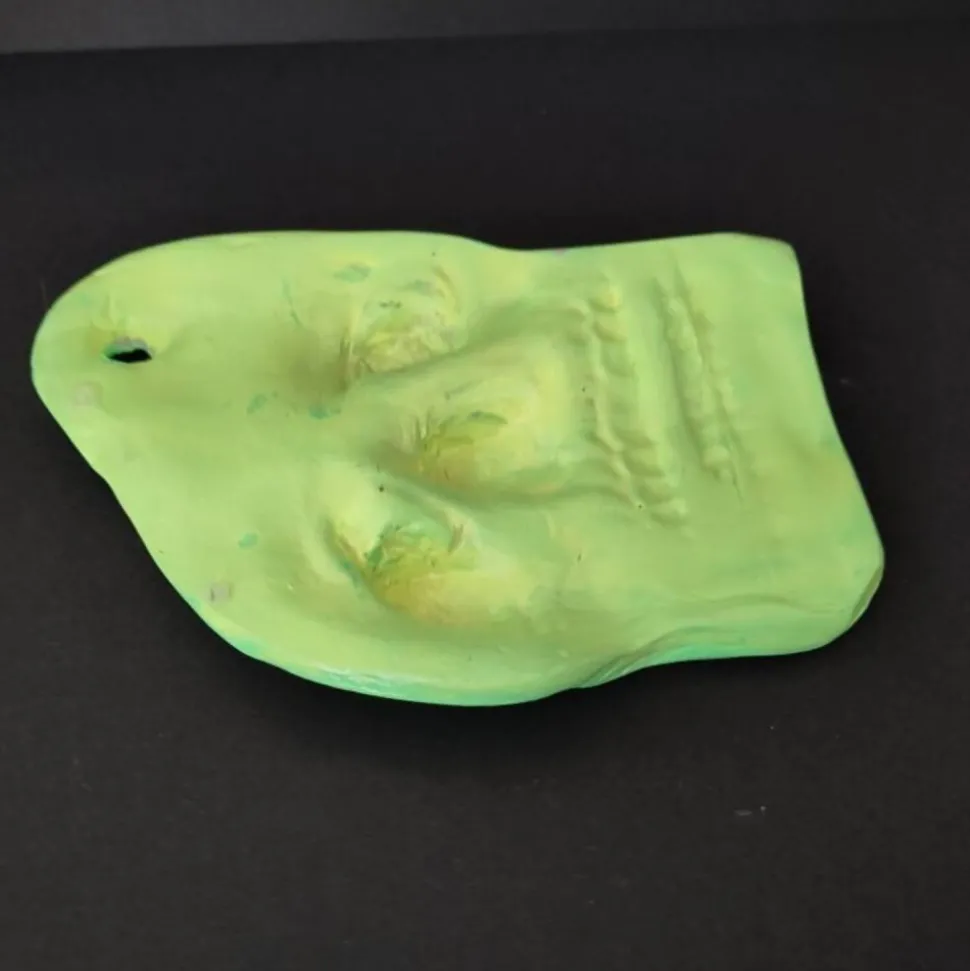 Bei Tageslicht zeigt sich seine hellgrüne, leicht schiefe Form – rau, unperfekt, lebendig. Doch sobald das Schwarzlicht angeht, verwandelt sich das Stück in eine kleine leuchtende Sensation: Unter UV-Licht erstrahlt der Schädel in gespenstischem Glanz und scheint fast selbst ein Eigenleben zu entwickeln.