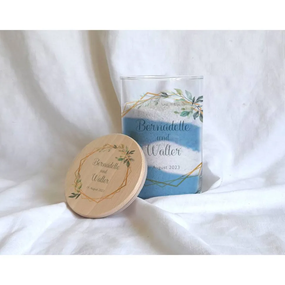 Bei Kerzensand bekommen Sie noch einen Docht dazu, sodass Sie direkt nach der Sandzeremonie Ihre individuelle Hochzeitskerze entzünden können.