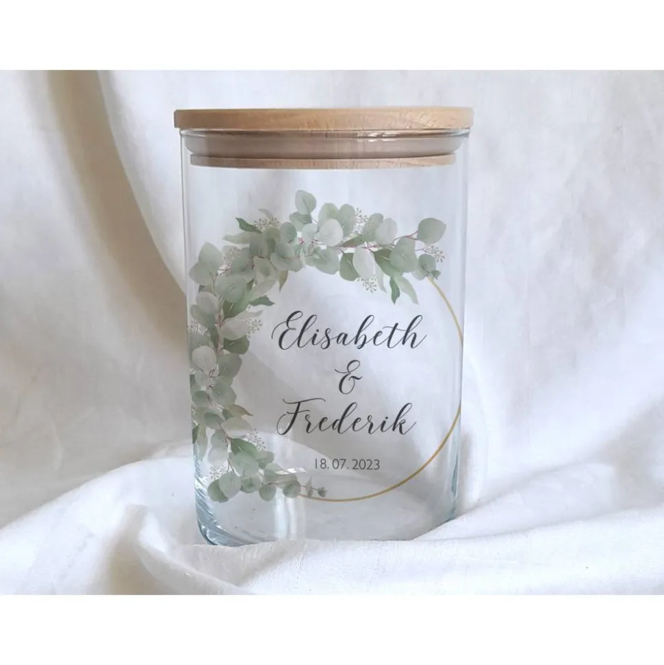 Das Glas ist 16 cm hoch und hat einen Durchmesser von 10 cm. Es kommt mit einem Holzdeckel der auf Wunsch ebenfalls bedruckt ist.