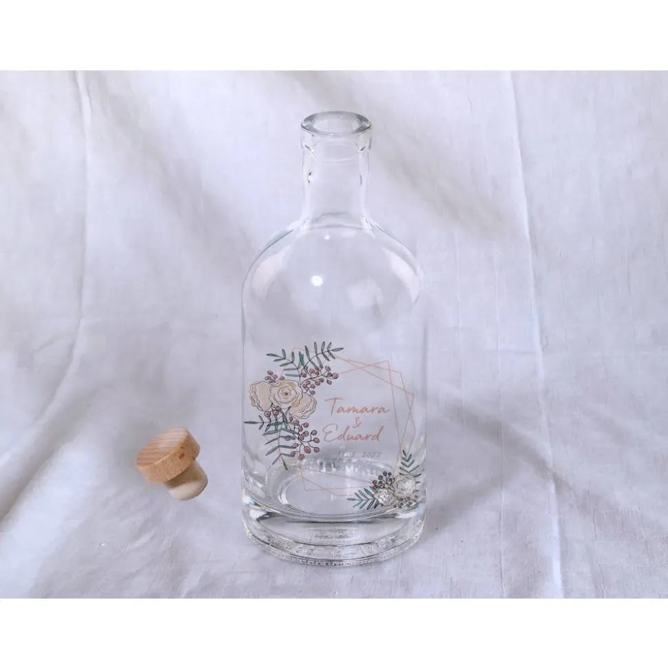Die Flasche ist 19 cm hoch undn hat einen Durchmesser von 8,5 cm. Sie kommt mit einem Holzkopfkorken der nicht bedruckt wird.