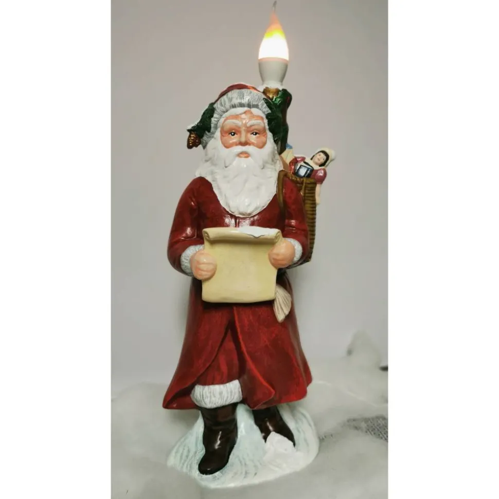 Der Santa ist ca 59cm hoch, Material ist Keramik. Die Figur ist aufwendig bemalt und zweimal wetterfest versiegelt. Er kann draussen stehen, sollte aber vor Frost geschützt werden. Im Lieferumfang ist ein Euro Kabel mit An und Ausschalter, 2m Länge und eine LED Glühlampe in Tropfenform enthalten.