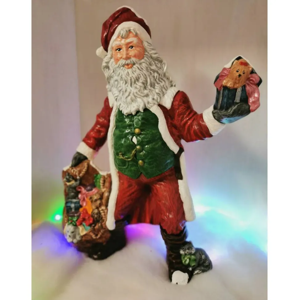 Der Santa ist ca 42cm hoch, Material ist Keramik. Die Figur ist aufwendig bemalt und zweimal wetterfest versiegelt. Er kann draussen stehen, sollte aber vor Frost geschützt werden. Pr
