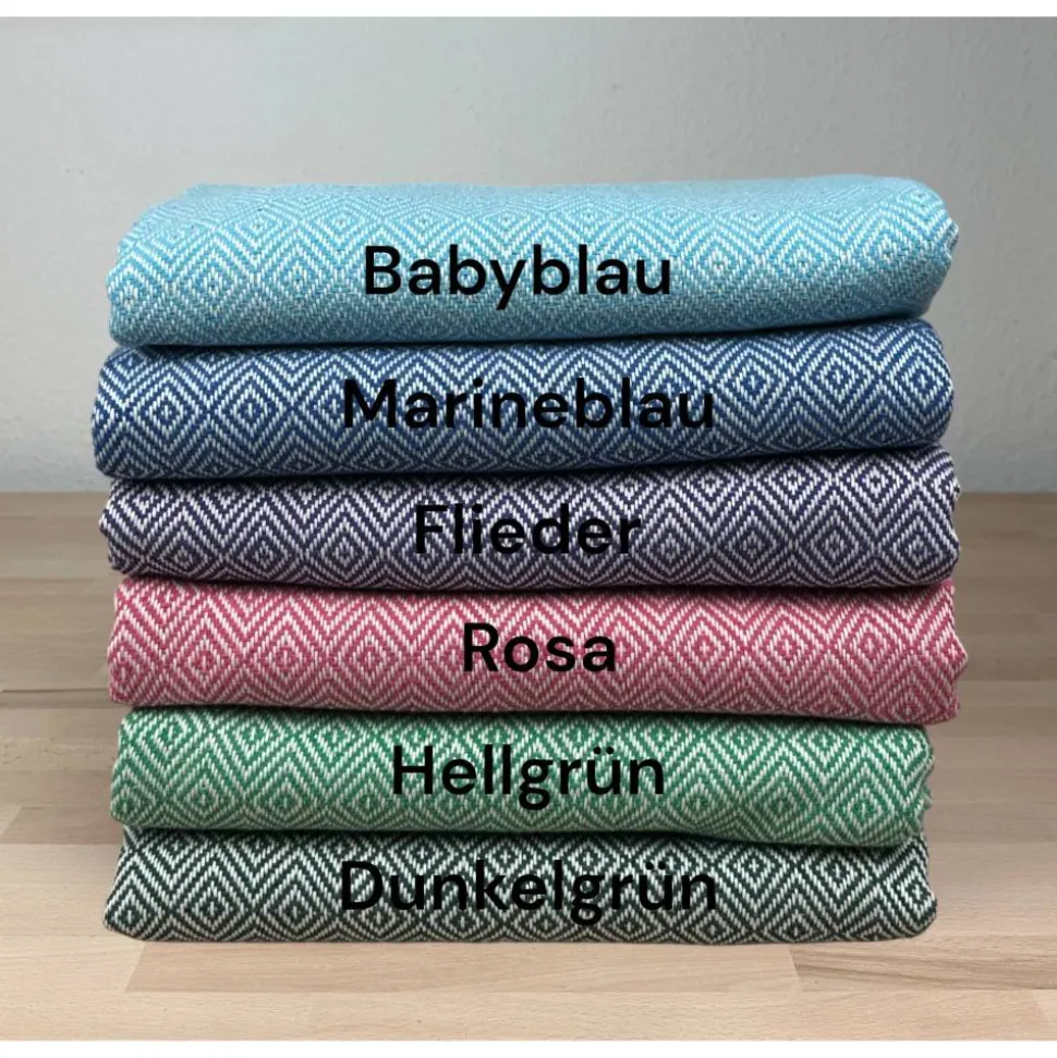 Meine Baumwolltücher, Hamamtücher in den Maßen 100x180cm in 13 wunderschönen Farben, sind super saugfähig, trocken sehr schnell und sind zudem beidseitig verwendbar.