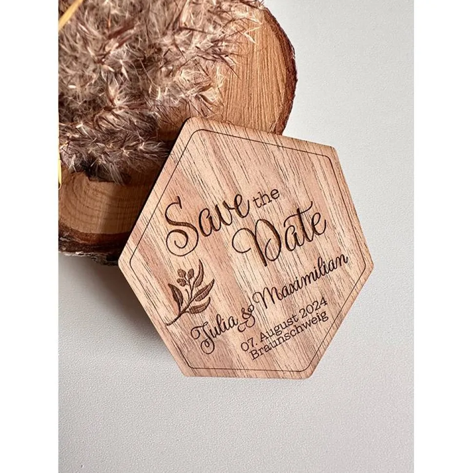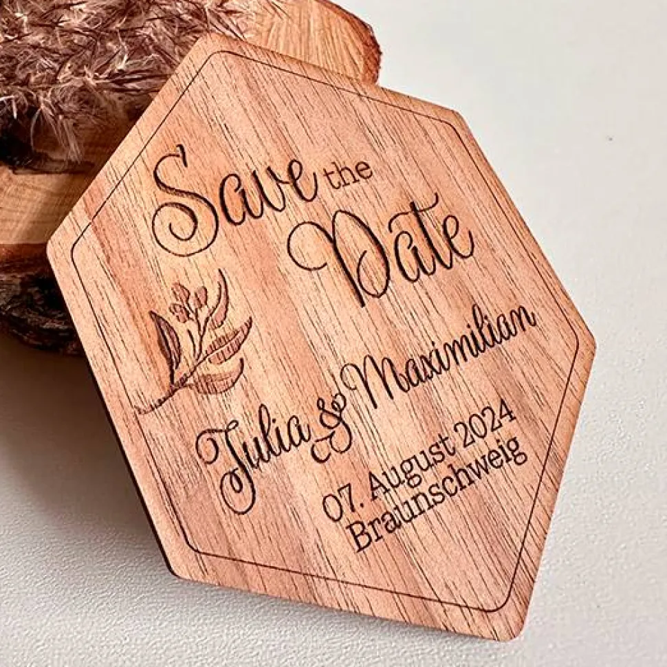 Die Magnet Karten werden aus Walnussholz hergestellt, dadurch erhalte die „Save the Date“ Magnete einen einzigartigen und natürlichen Charme, der eure Hochzeitseinladungen zu besonderen Unikaten macht und auch eine schöne Erinnerung an den besten Tag im Leben ist.