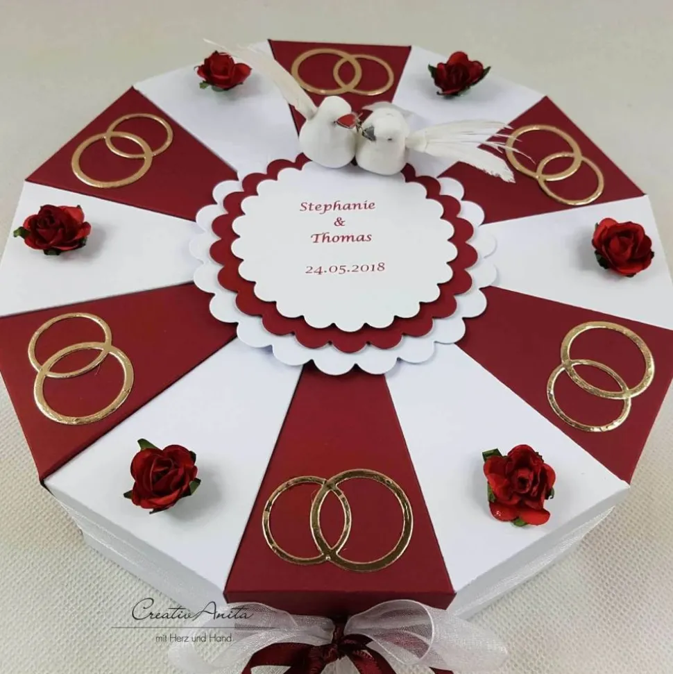 Die einzelnen Tortenstücke können nach Ihrer Fantasie befüllt werden. Das außergewöhnliche Geldgeschenk ist ein Handmadeprodukt, welches mit viel Liebe zum Detail von uns hergestellt und mit passenden Hochzeitsaccessoires dekoriert wird.