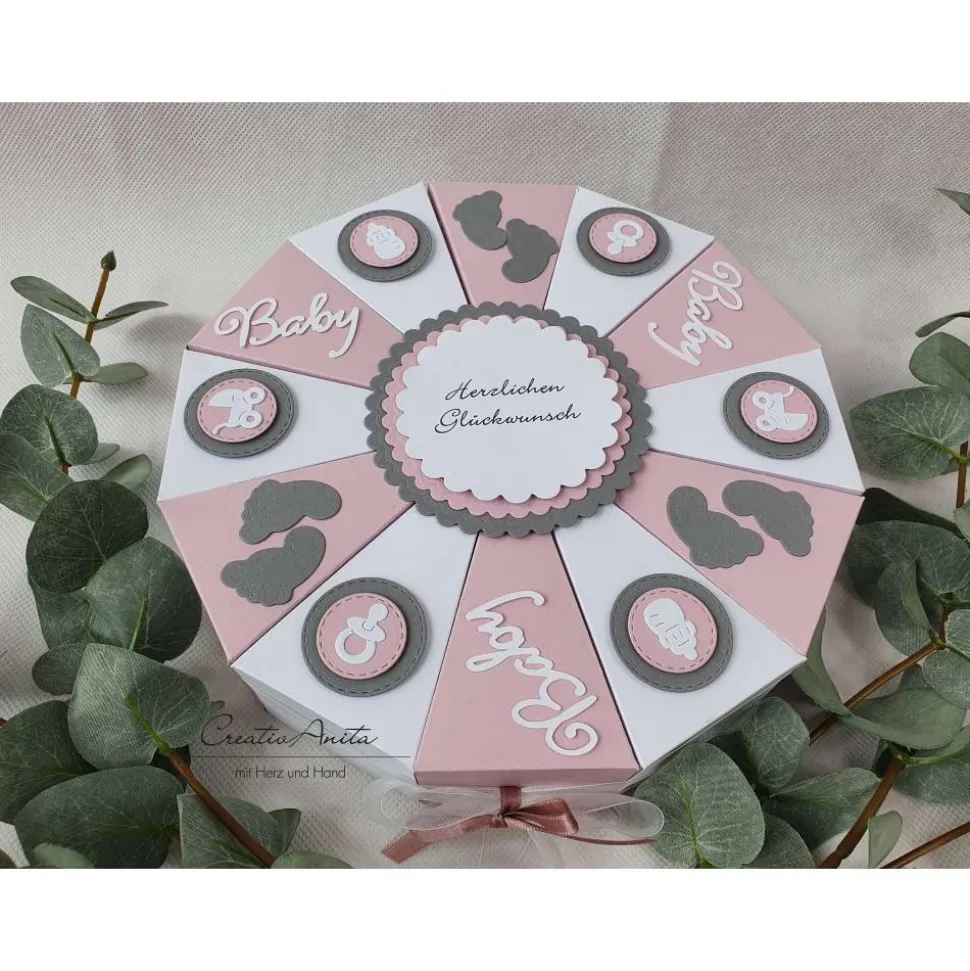 12 einzelne Tortenstücke, jedes einzeln nach Belieben befüllbar (z.B. mit Geld, Gutschein, Sprüchen, Süssigkeiten, Babyaccessoires usw.)