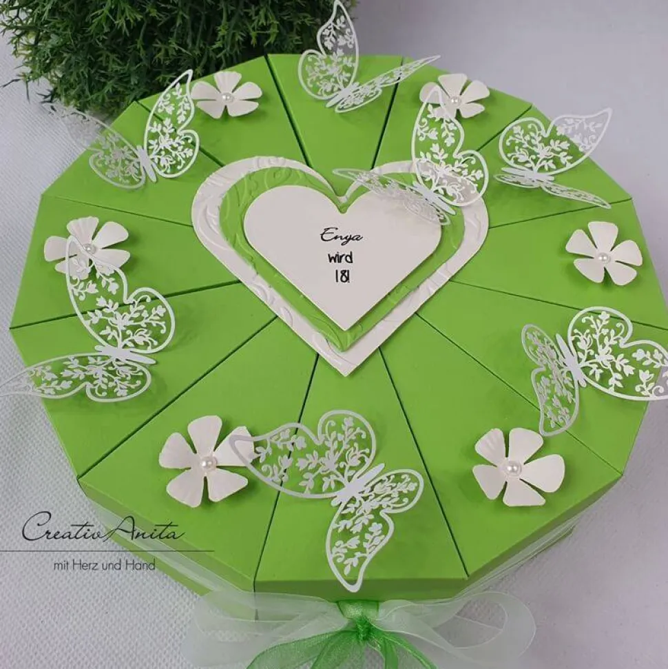 12 einzelne Tortenstücke, jedes einzeln nach Belieben befüllbar (z.B. mit Geld, Gutschein, Mini-Schafmilchseifen, Sprüchen, Süssigkeiten usw.)