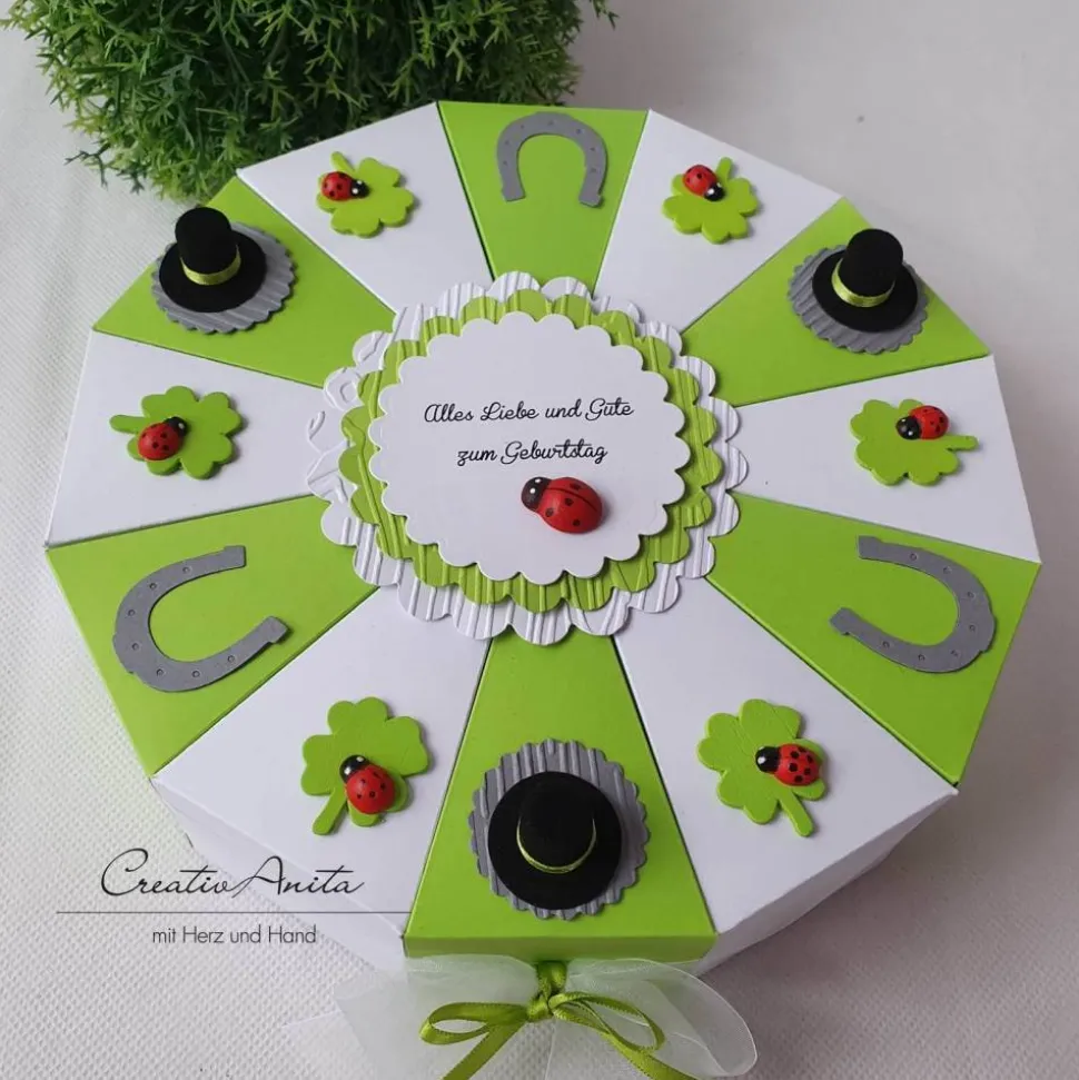 Material: kräftiger Tonkarton, Glückssymbole, Stanzelemente, Schleifenband, anlassbezogene Deko, beschriftbarer Aufleger