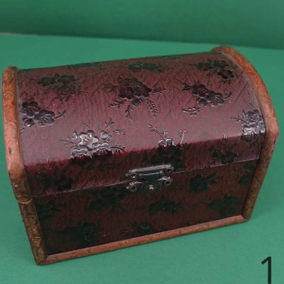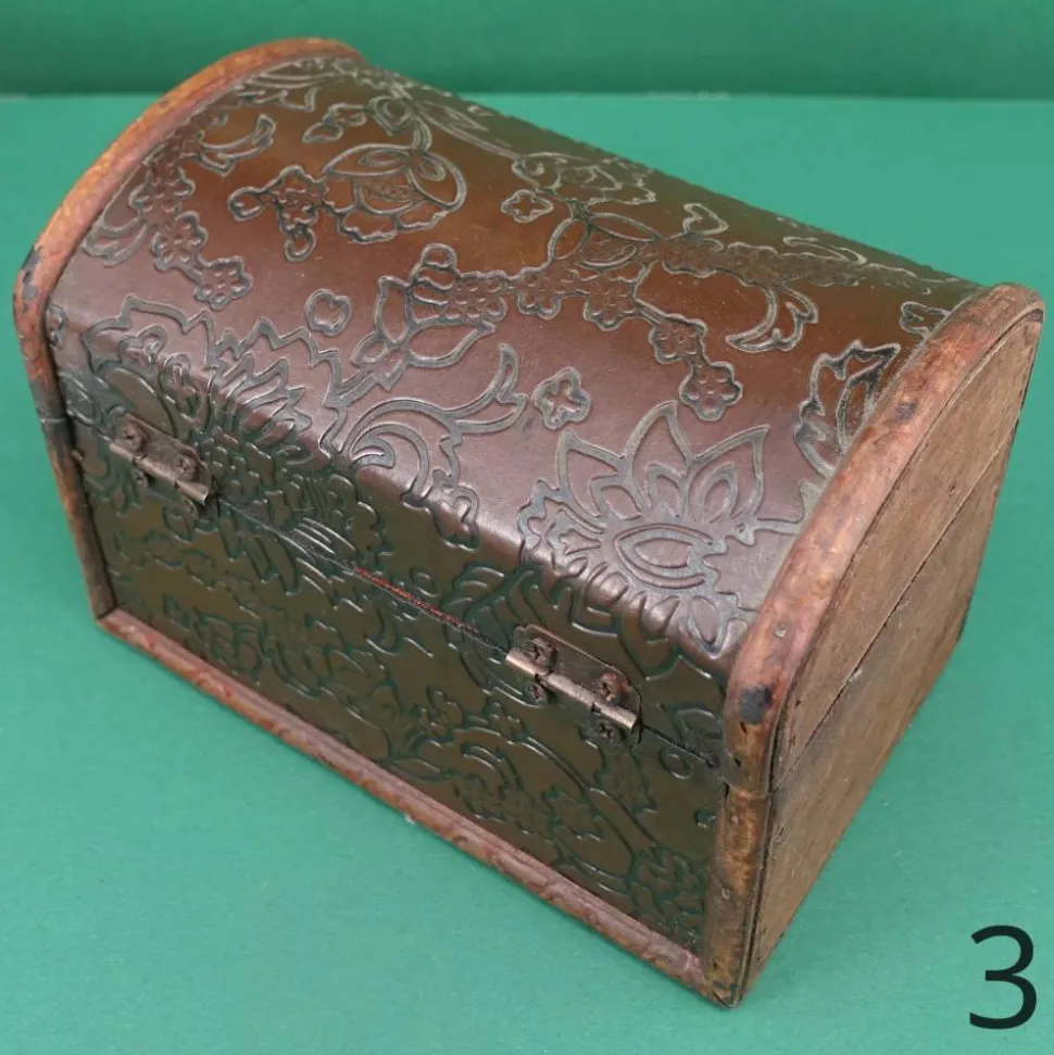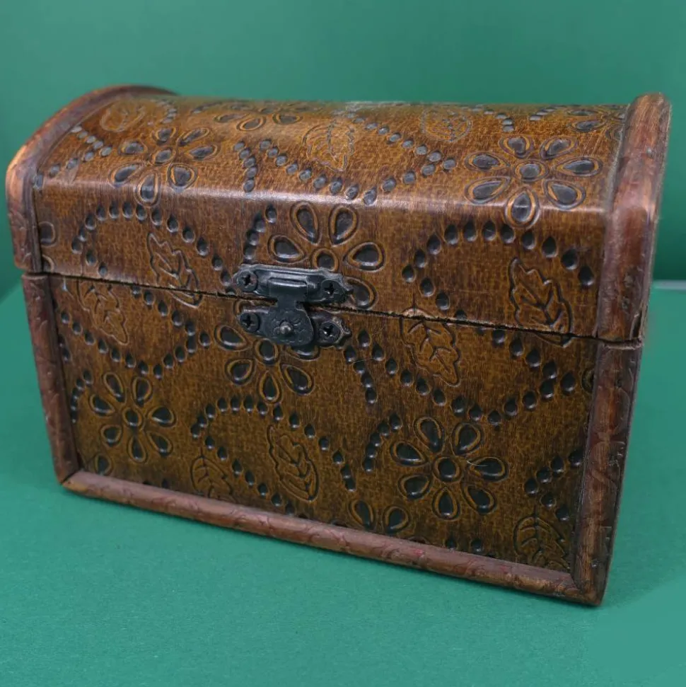 Diese kleine Truhe sieht aus, als wäre sie von früher. Der Korpus besteht aus Sperrholz, der Bezug ist wohl eine Prägefolie. Sie eignet sich als Geld- oder Geschenkverpackung ebenso wie als Schatztruhe für die ersten Kostbarkeiten von Kindern. Diese Truhen sind nicht perfekt gearbeitet, das verstärkt aber noch den Vintage-Charme.