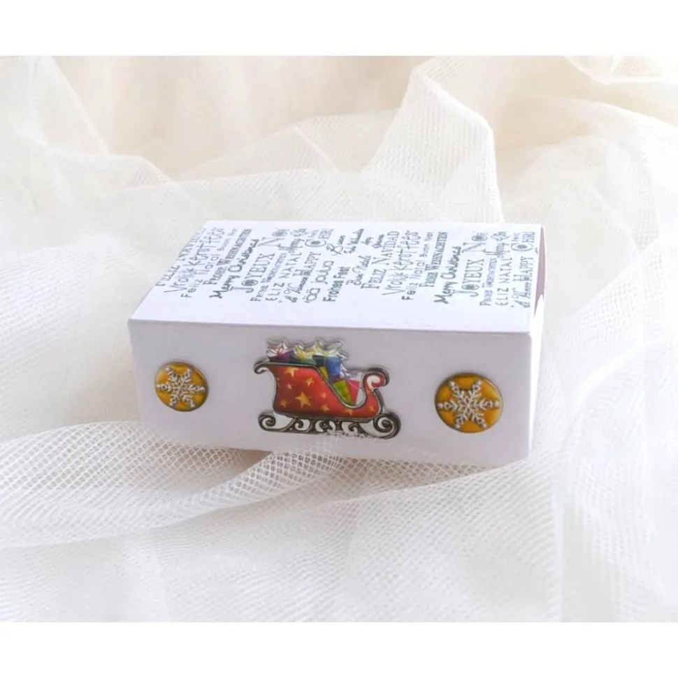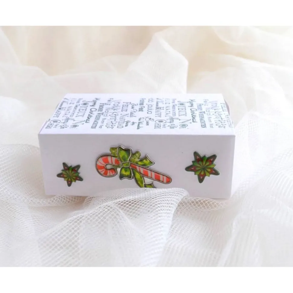 Schiebeschachtel (Nr. W3) mit Stempelmotiv „Frohe Weihnachten“ in verschiedenen Sprachen in weiß-grün. Auf den Seiten sind kleine Weihnachtmotive aus Puffy-Stickern angebracht. Sie eignet sich zum Verschenken von Geld, Gutschein, Schmuck, Süßigkeiten und sonstigen kleinen Geschenken. Die Schachtel ist aufschiebbar und kann wieder verwendet werden.