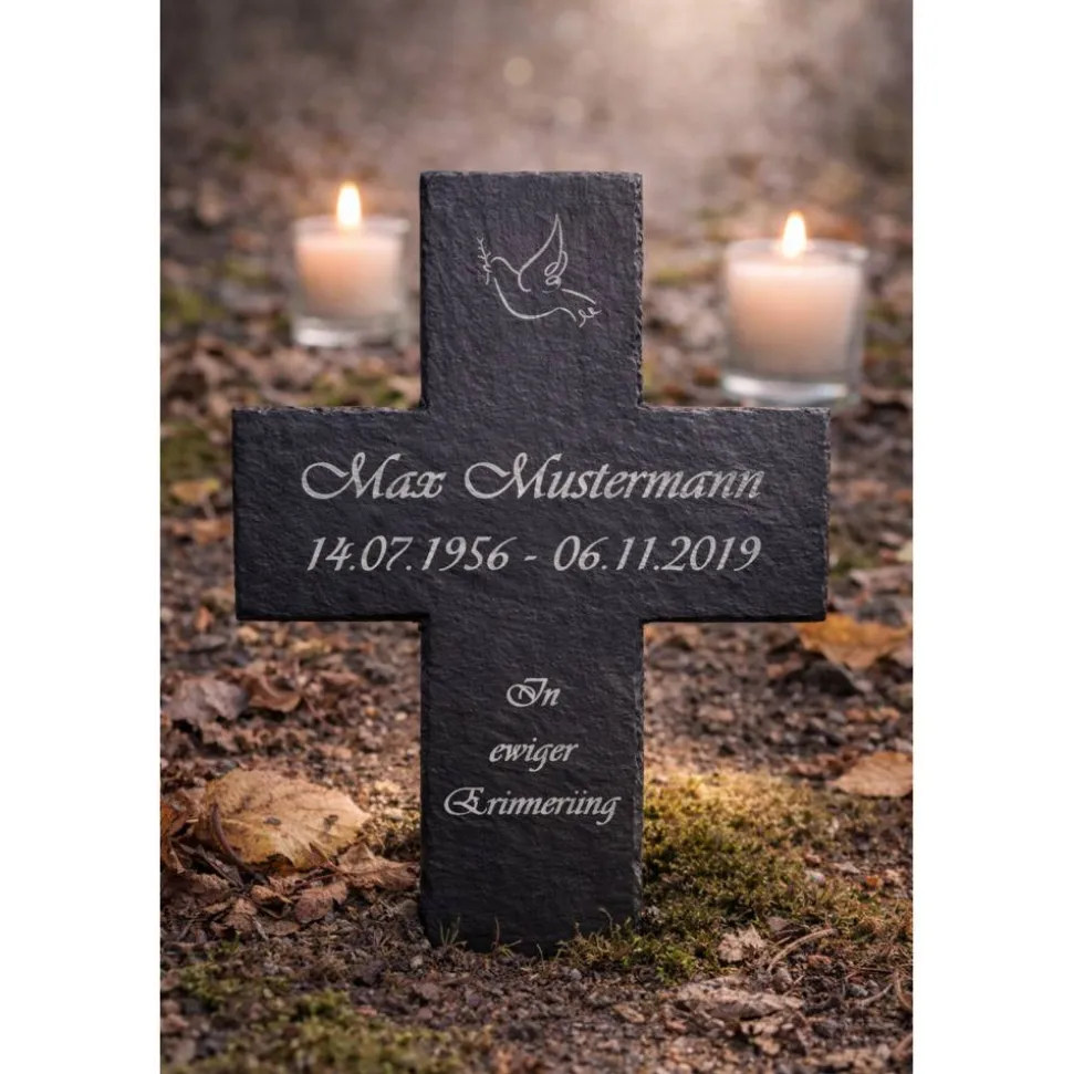 Schaffe einen Ort der Erinnerung und des Trostes mit einem personalisierten Schieferkreuz (30x20cm) – langlebig, zeitlos und mit individueller Wunschgravur.