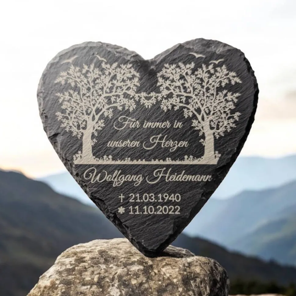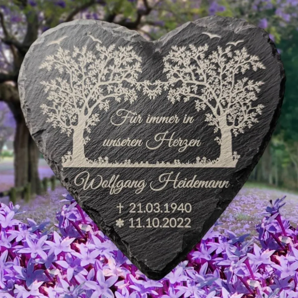Bild und Schrift werden mittels modernsten Hochleistungs-Lasern fest im Schiefer eingebrannt. Die Grabplatte wird also nicht bedruckt oder beklebt. Die Gravur ist wetterbeständig und nutz sich auch bei dauerhafter Sonneneinstrahlung nicht ab.