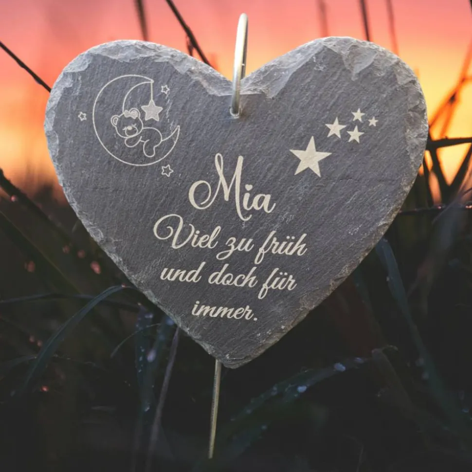 Bild und Schrift werden mittels modernsten Hochleistungs-Lasern fest im Schiefer eingebrannt. Die Grabplatte wird also nicht bedruckt oder beklebt. Die Gravur ist wetterbeständig und nutz sich auch bei dauerhafter Sonneneinstrahlung nicht ab.
