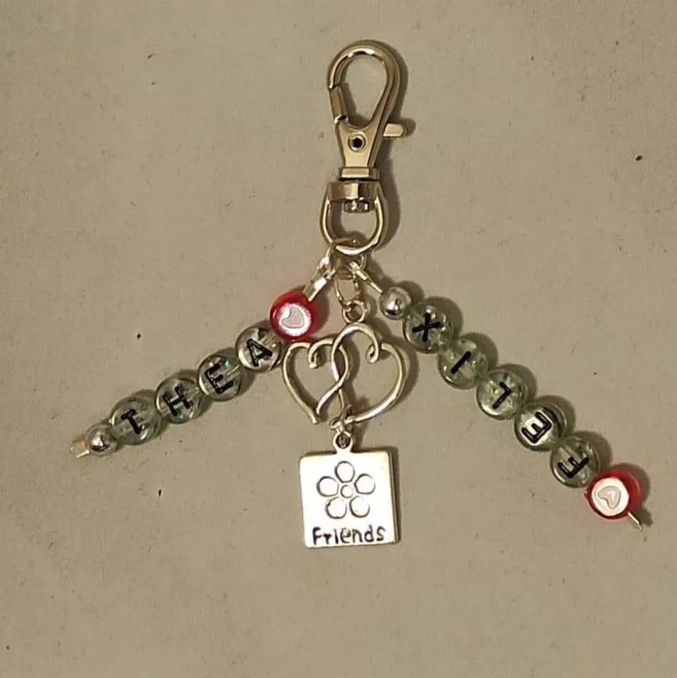 Ob Sie den Schlüsselanhänger „nur“ mit Friends/Herz-Anhänger oder ergänzt mit 2 Namensanhängern möchten, können Sie im Dropdown-Menü „Stil“ auswählen und im Feld „Personalisierung“ können Sie die zwei Wunschnamen eingeben.