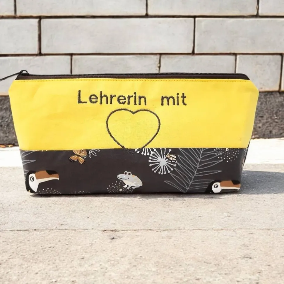 Süßes Statement Mäppchen aus Baumwolle genäht, bestickt mit den Worten: „Lehrerin mit ♥“. Ein tolles Abschiedsgeschenk für Lehrerinnen, das in Erinnerung bleibt, oder als kleines Dankeschön, sowie auch passend zum Geburtstag. Das Mäppchen ist verstärkt und hat mit seinen 4cm Bodentiefe einen guten Stand.
