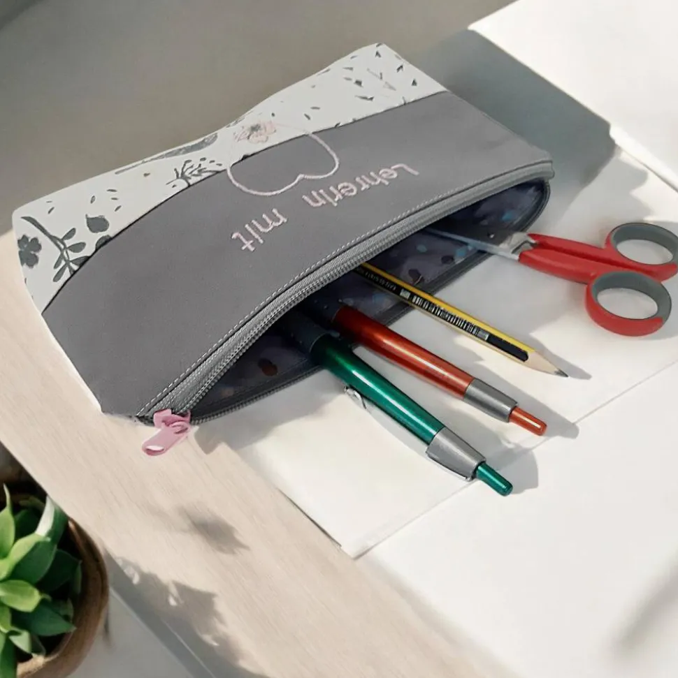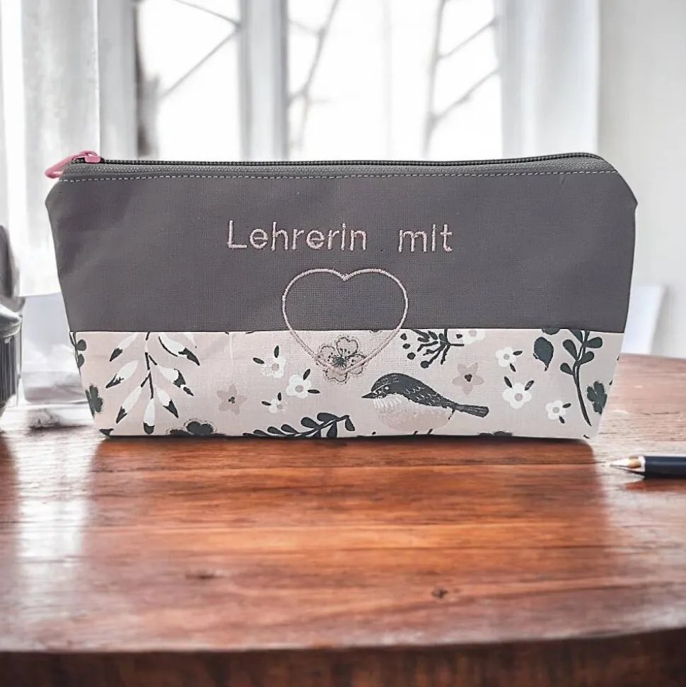 Süßes Statement Mäppchen aus Baumwolle genäht, bestickt mit den Worten: „Lehrerin mit Herz“. Ein tolles Abschiedsgeschenk für Lehrerinnen, das in Erinnerung bleibt, oder als kleines Dankeschön, sowie auch passend zum Geburtstag. Das Mäppchen ist verstärkt und hat mit seinen 4cm Bodentiefe einen guten Stand.