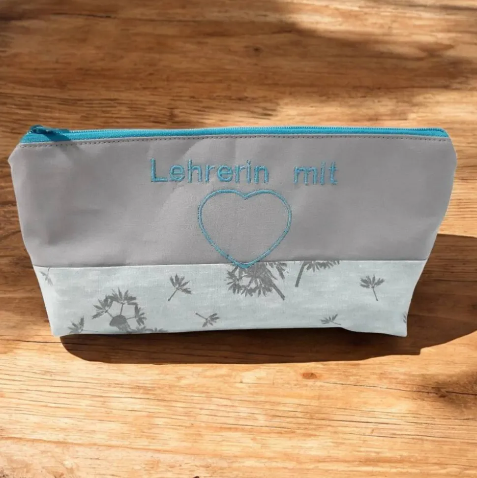 Süßes Statement Mäppchen aus Baumwolle genäht, bestickt mit den Worten: „Lehrerin mit ♥“. Ein tolles Abschiedsgeschenk für Lehrerinnen, das in Erinnerung bleibt, oder als kleines Dankeschön, sowie auch passend zum Geburtstag. Das Mäppchen ist verstärkt und hat mit seinen 4cm Bodentiefe einen guten Stand.