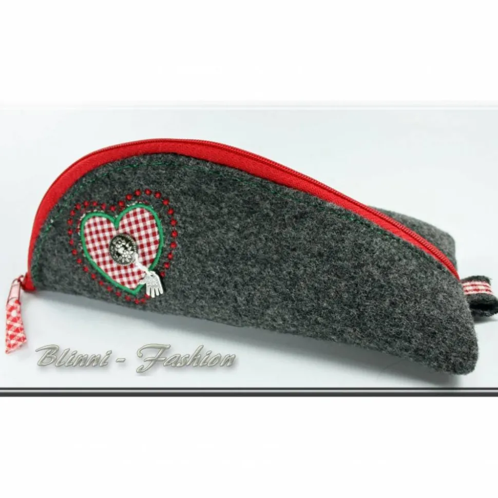 Dieses Mäppchen wurde aus einem hochwertigen Wollstoff genäht. Innen ist es mit rot-weiß gestreiftem Baumwollstoff gefüttert. Ein süßes Herz aus rotkariertem Stoff wurde appliziert, bestickt und mit Knopf und kleinem Anhänger aufgehübscht.