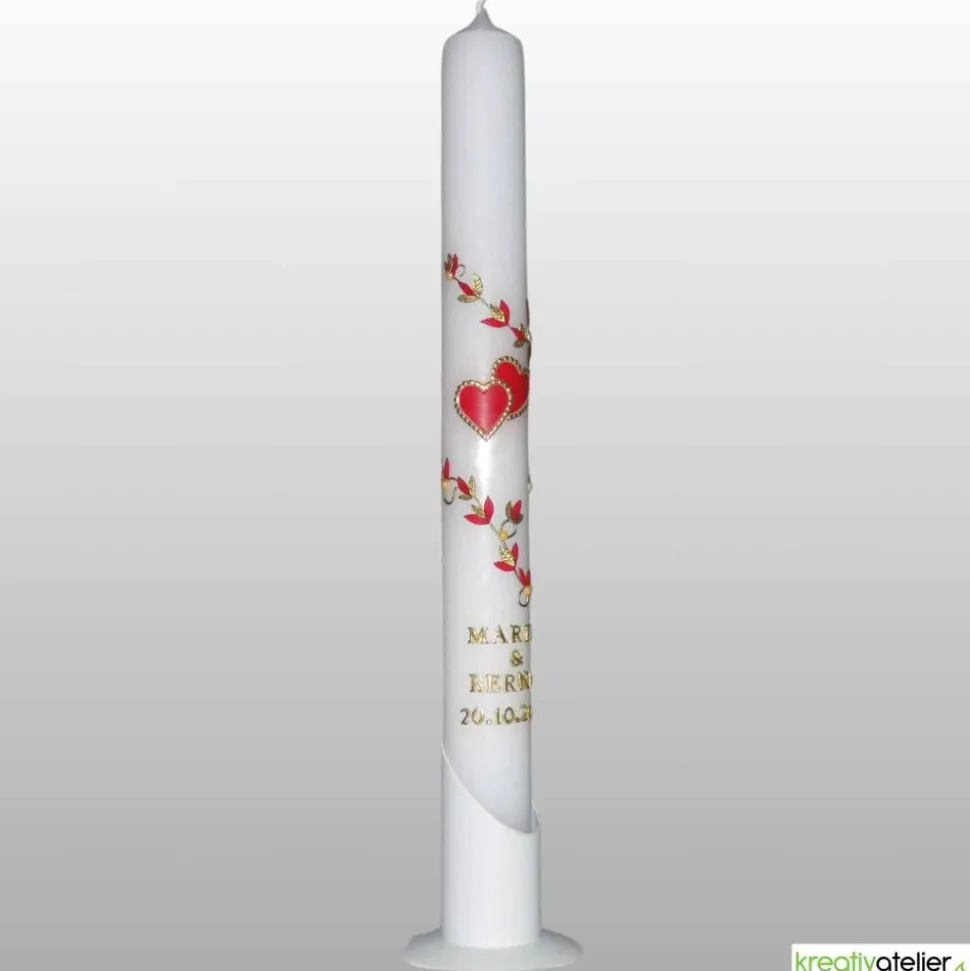 Diese handgefertigte Kerze ist mit einer zarten Blumenranke in Rubinrot und Gold verziert. Die beiden Herzen in der Mitte der Kerze sind ineinander verschlungen und werden von einem goldenen Rand umschlossen. Jedes dieser Ornamente auf der Kerze wird von mir in mühevoller Handarbeit einzeln ausgeschnitten, bevor ich es kunstvoll auf der Kerze arrangiere.
