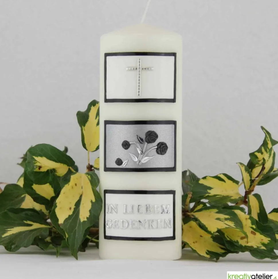 Die edle Silberoptik der Kerze verleiht ihr eine besondere Ausstrahlung, die an den Verstorbenen erinnert. Der Spruch „In liebem Gedenken“ aus silbernen Wachsbuchstaben auf der unteren Kachel ist ein fester Bestandteil der Trauerkerze und unterstreicht das Andenken an den Verstorbenen.