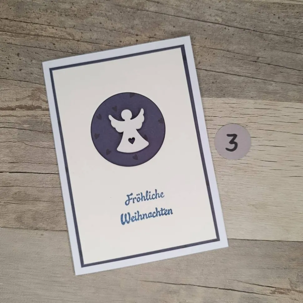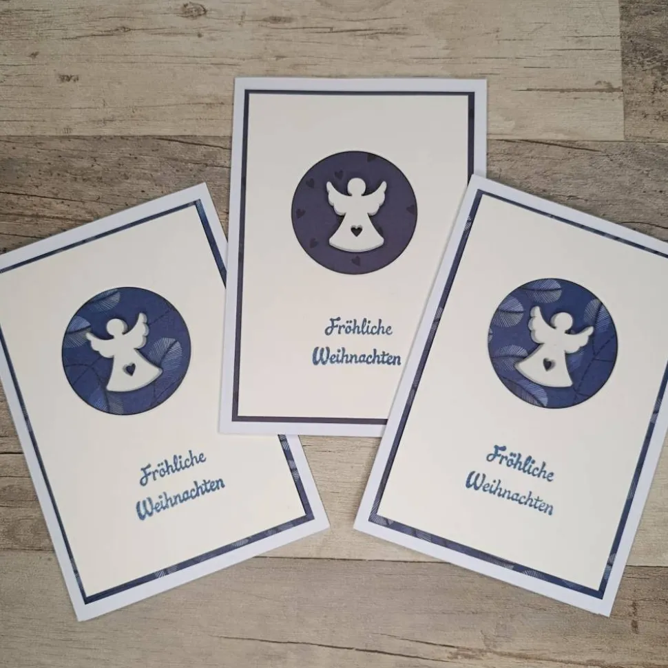 Entdecke schlichte Weihnachtskarten mit elegantem blauem Designpapier auf weißem Kartenrohling. Jede Karte ist mit einem gestempelten Spruch und einem weißen Holzengel verziert. Die Maße betragen 14,8 x 10,5 cm. Du erhältst die Karte mit passendem Einlegeblatt und Briefumschlag. Die perfekte Wahl für stilvolle Weihnachtsgrüße im modernen Look!