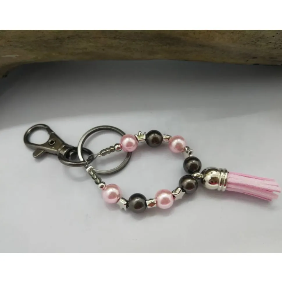 Verwendet habe ich Schmuckdraht zur besseren Stabilität, Schlüsselringe und Karabinerhaken in verschiedenen Farben: gold, rosegold, silber und schwarz. Hier habe ich einen dunkelgrauen Karabiner und Schlüsselring verarbeitet.