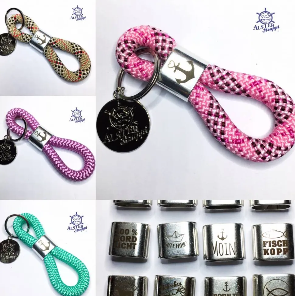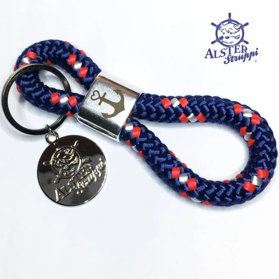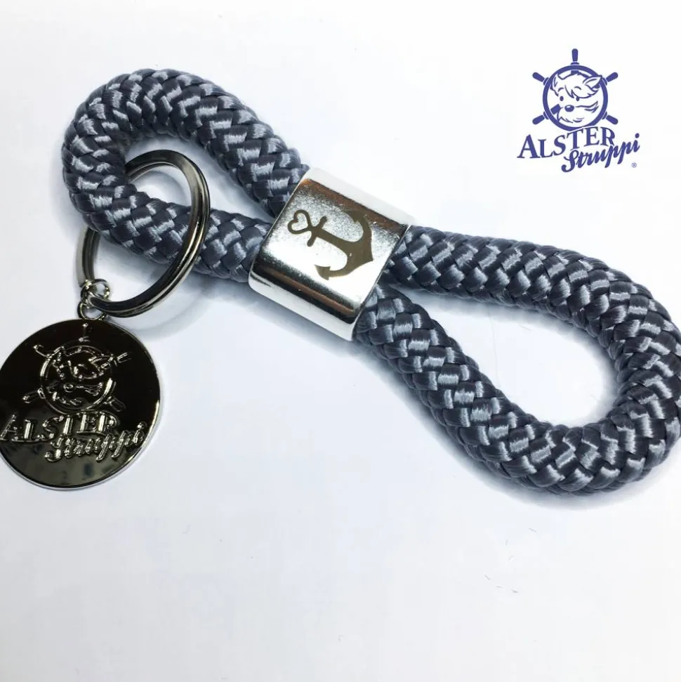Ein schöner handgefertigter Schlüsselanhänger aus PPM Tau, Kletterseil oder Segeltau, der Marke AlsterStruppi aus Tau 10 mm, Länge ca. 12 cm, Slider versilbert, Motiv nach Wunsch, Schlüsselring in silberfarben.