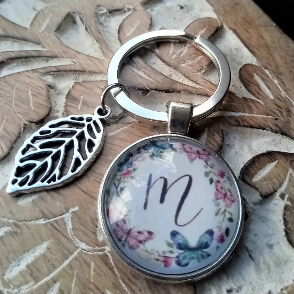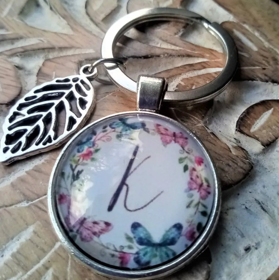 an den Anhänger ist ein 25cm großer Schlüsselring und einem kleinen Blattanhänger oder Rosenanhänger (muss aber nicht)