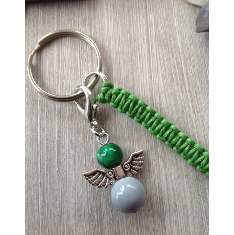 Der Anhänger wurde aus grünem, gewachstem Baumwollband geknüpft und mit einem Howlithkreuz ( Höhe 16mm ), einem Metallanker (Höhe 1,8 cm ), einem Metallherzchen, einer Mondsteinperle, (Duchmesser 6mm ) und roten Rocailles verziert. Das Engelchen aus einer grauen Glasperle, Metallflügeln und einer grünmelierten Glasperle ist an einem 16 mm hohem Karabiner befestigt. Der Schlüsselring hat einen Durchmesser von 2,2 cm. Gesamtlänge: 10,5 cm.