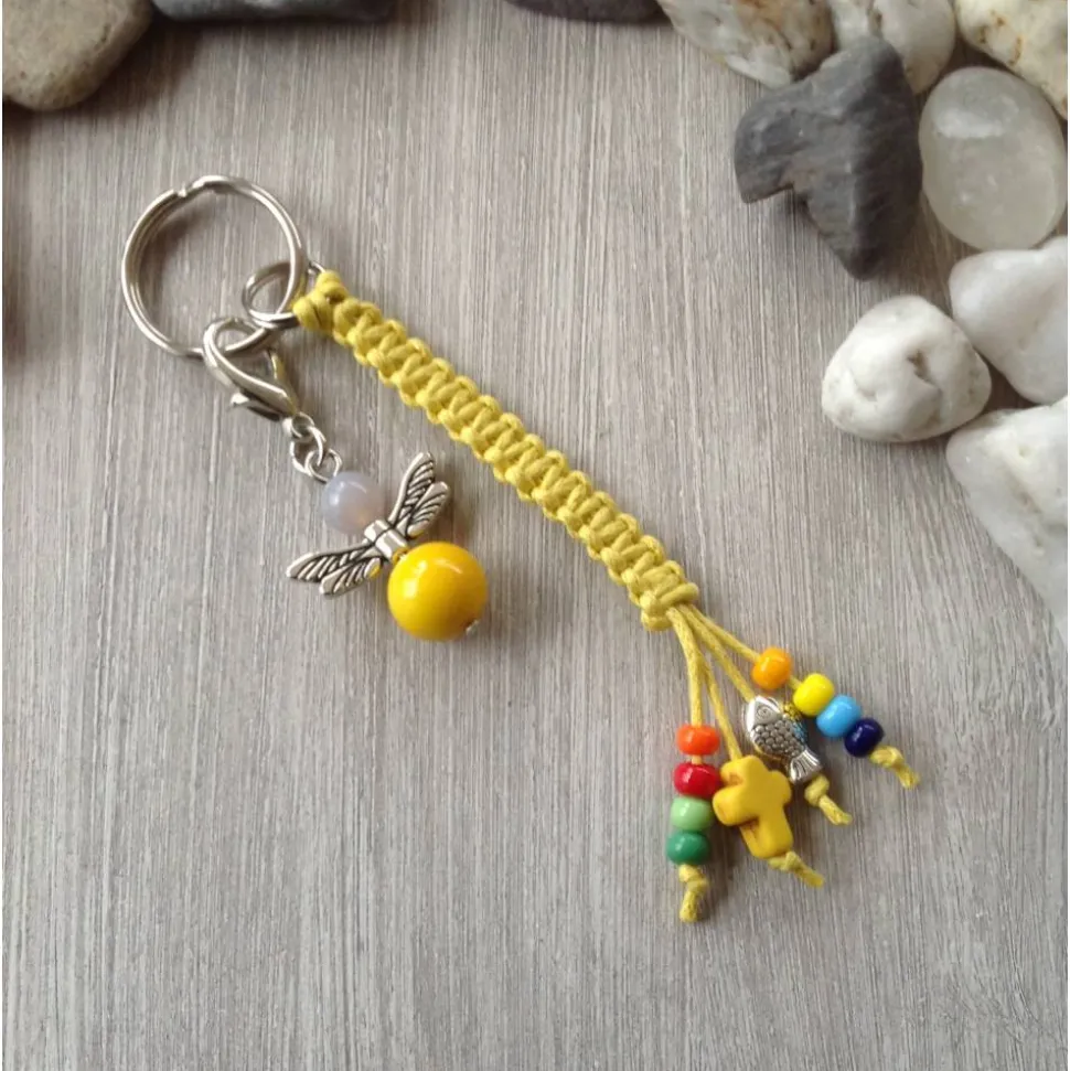 Der Anhänger wurde aus gelben, gewachstem Baumwollband geknüpft und mit einem Howlithkreuz ( Höhe 10mm ), einem Metallfisch (Höhe 0,9 cm ) und bunten Rovcailles verziert. Das Engelchen aus Metallflügeln und Glasperlen ist an einem 16 mm hohem Karabiner befestigt. Der Schlüsselring hat einen Durchmesser von 1,7 cm. Gesamtlänge: 10 cm.