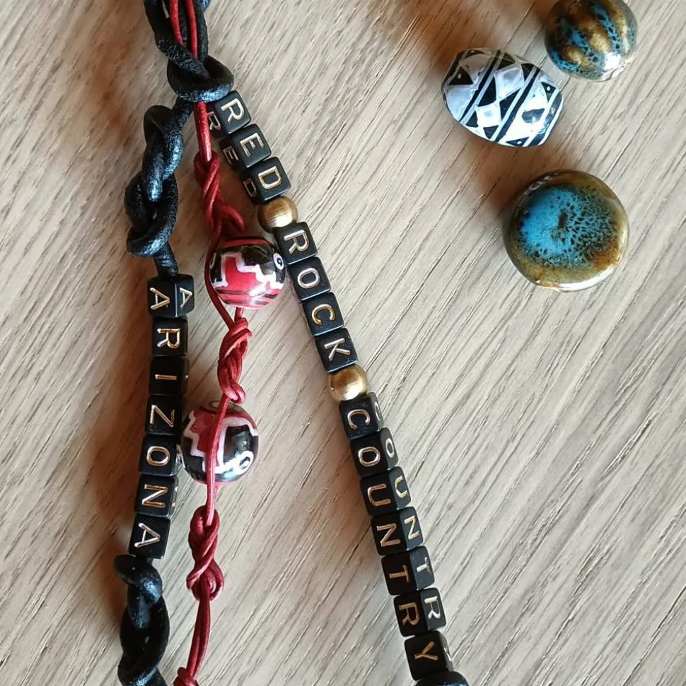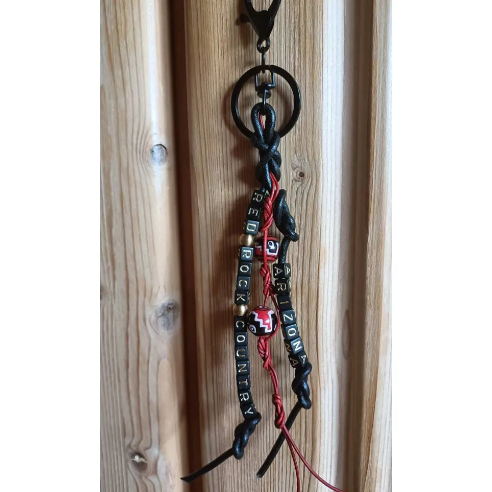 An dem 33 mm langen, schwarz lackierten Karabiner ist mit einem drehbaren Wirbel ein separater Schlüsselring von 30 mm Durchmesser befestigt. Daran wurden eine feste, schwarze Lederschnur und eine feine in Weinrot angebracht. Die Beschriftung ARIZONA – RED ROCK COUNTRY ist auf schwarzen Acrylwürfeln (6mm) in goldenen Buchstaben gefädelt. Die Worte werden durch goldfarbene Messingkugeln getrennt. Dazwischen, um sie vor Beschädigung zu schützen – habe ich die beiden handbemalten, rot-schwarzen, runden Keramikperlen (11 mm) mit Knoten untereinander fixiert. Sie sind mit einem Treppenmuster in Weiß verziert.
