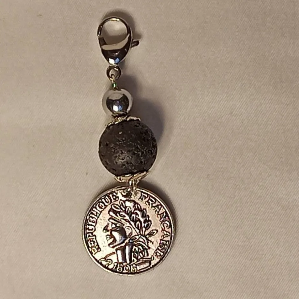 Schlüsselanhänger/Taschenbaumler zum Beduften – entdecke die kreative Verbindung aus Funktionalität und Wohlbefinden! Dieser einzigartige Duftschmuck ist mit einer schwarzen Lavaperle (14mmØ) und einem Glücksmünzen-Anhänger (23mmØ) ausgestattet und bietet dir die Möglichkeit, deinen Lieblingsduft immer bei dir zu tragen.