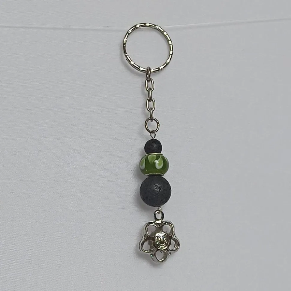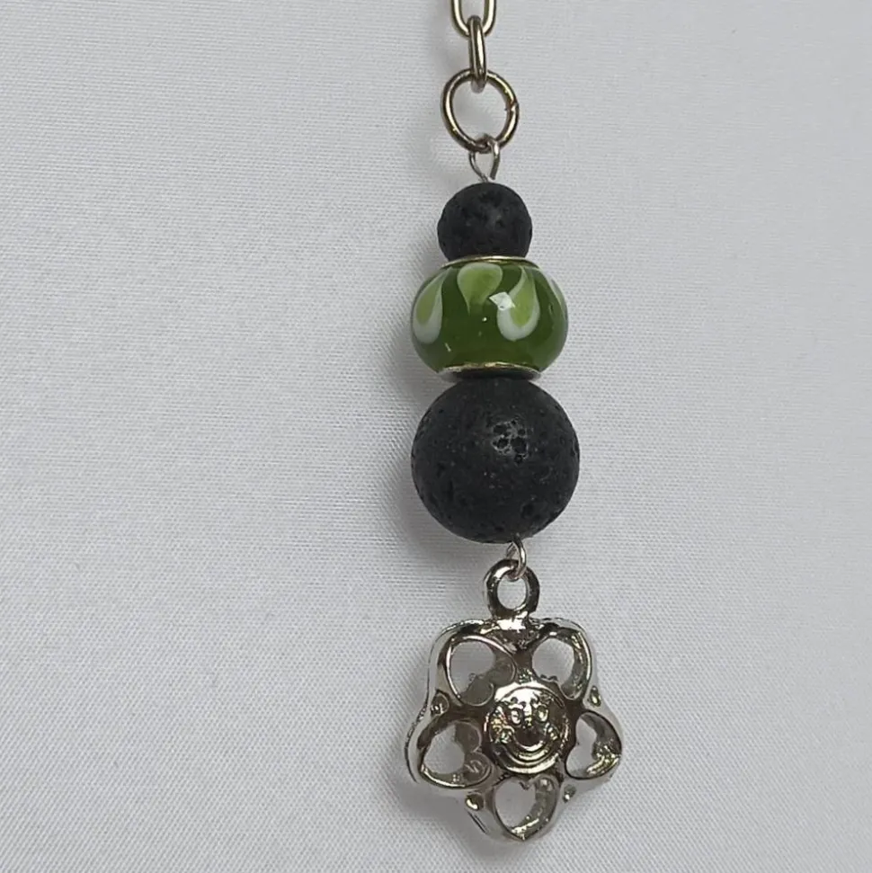Schlüsselanhänger/Taschenbaumler -zum Beduften- schw. Lavaperlen, Glas-Modulperle und Anhänger “Blume/Smiley