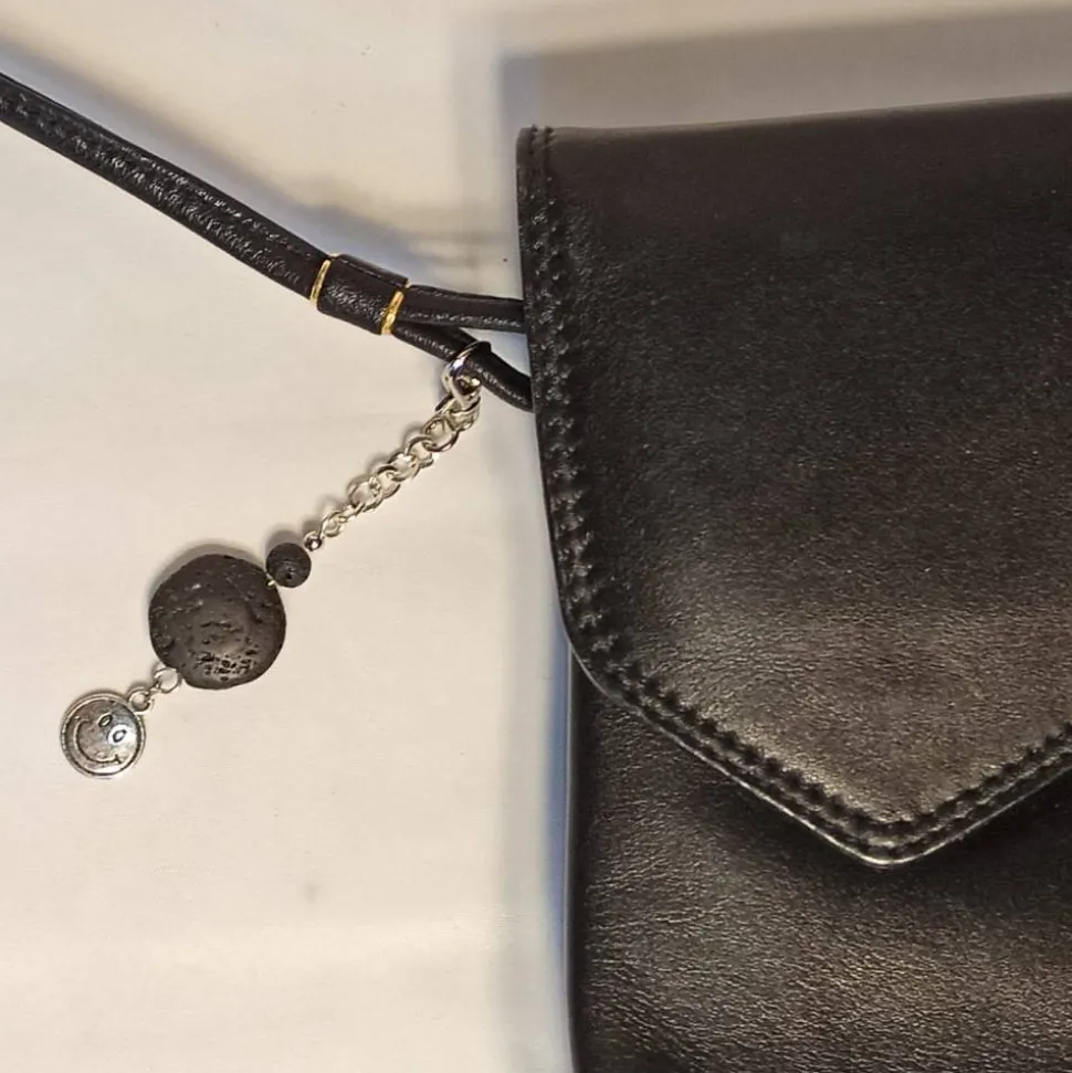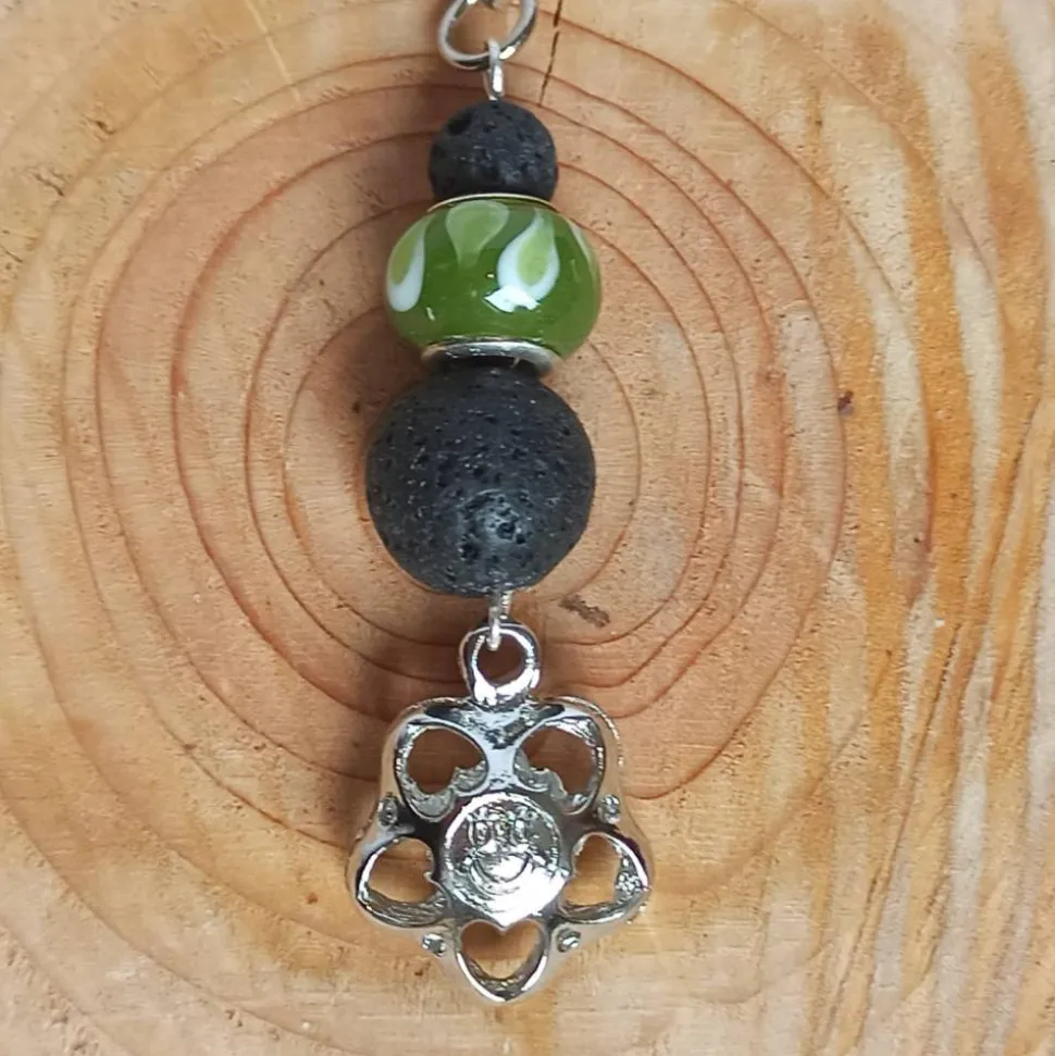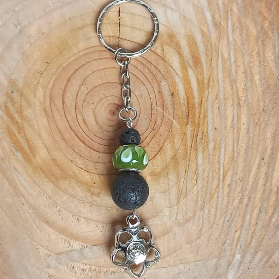 Schlüsselanhänger/Taschenbaumler -zum Beduften- schw. Lavaperlen, Glas-Modulperle und Anhänger ''Blume/Smiley