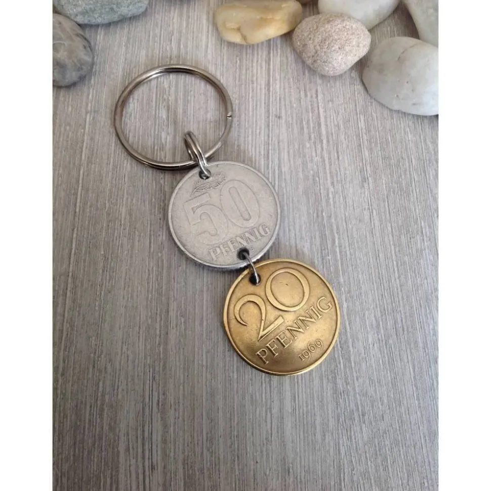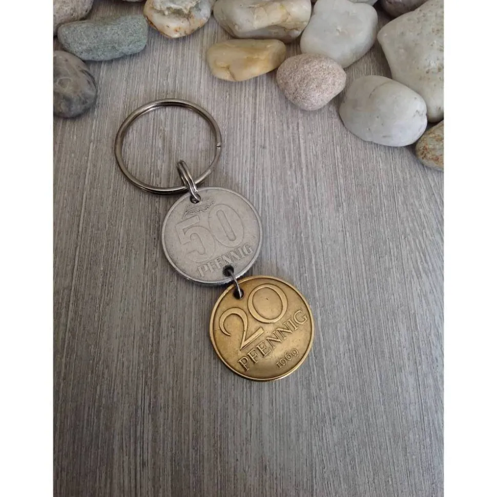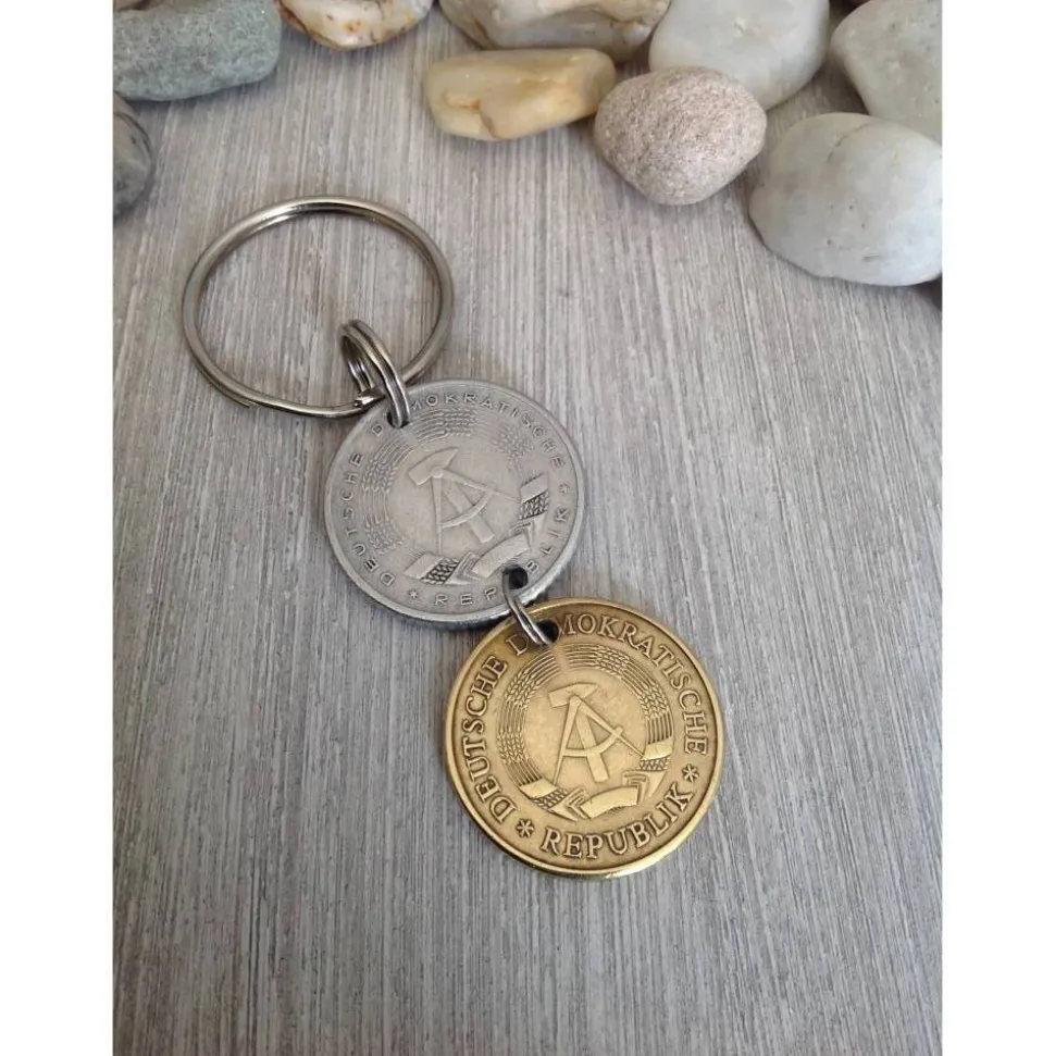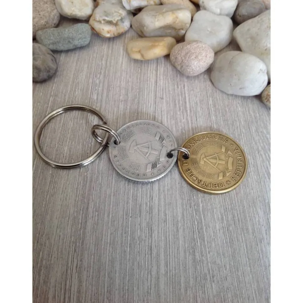 Schlüsselanhänger aus zwei alten Münzen aus der ehemaligen DDR. Die Münzen wurden durchbohrt, die Bohrungen entgratet und die Münzen mit Spaltringen verbunden.