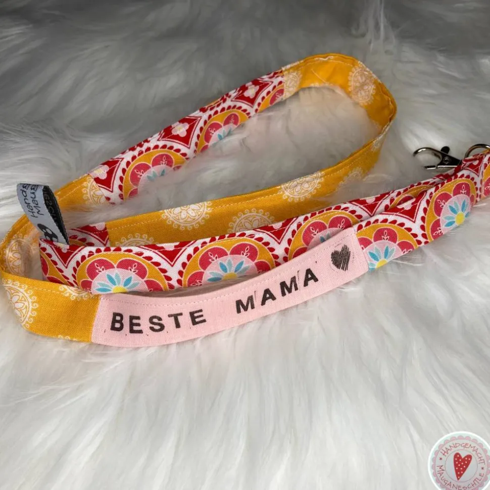 Schlüsselband, genäht aus verschiedenen Baumwollstoffen, bestempelt mit „Beste Mama“