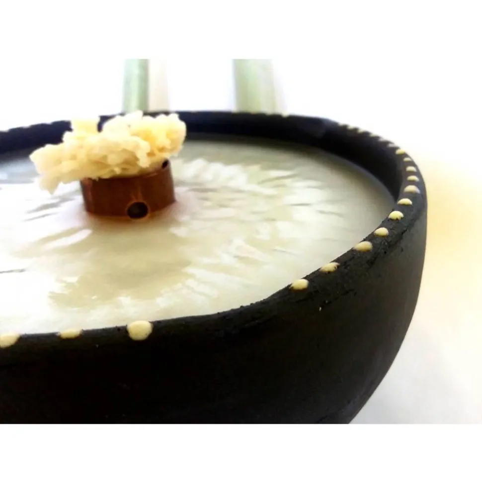 Ein Dauerdocht aus Glasfaser in einem hochwärmeleitenden Metallbrenner leitet flüssiges Wachs nach oben, wo es verbrennt.