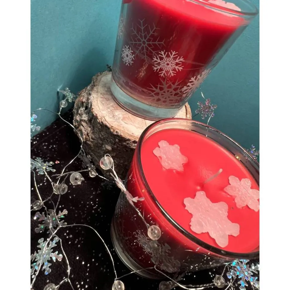 Farbe: Leuchtend Rot mit dekorativen weißen Schneeflocken aus Wachs.