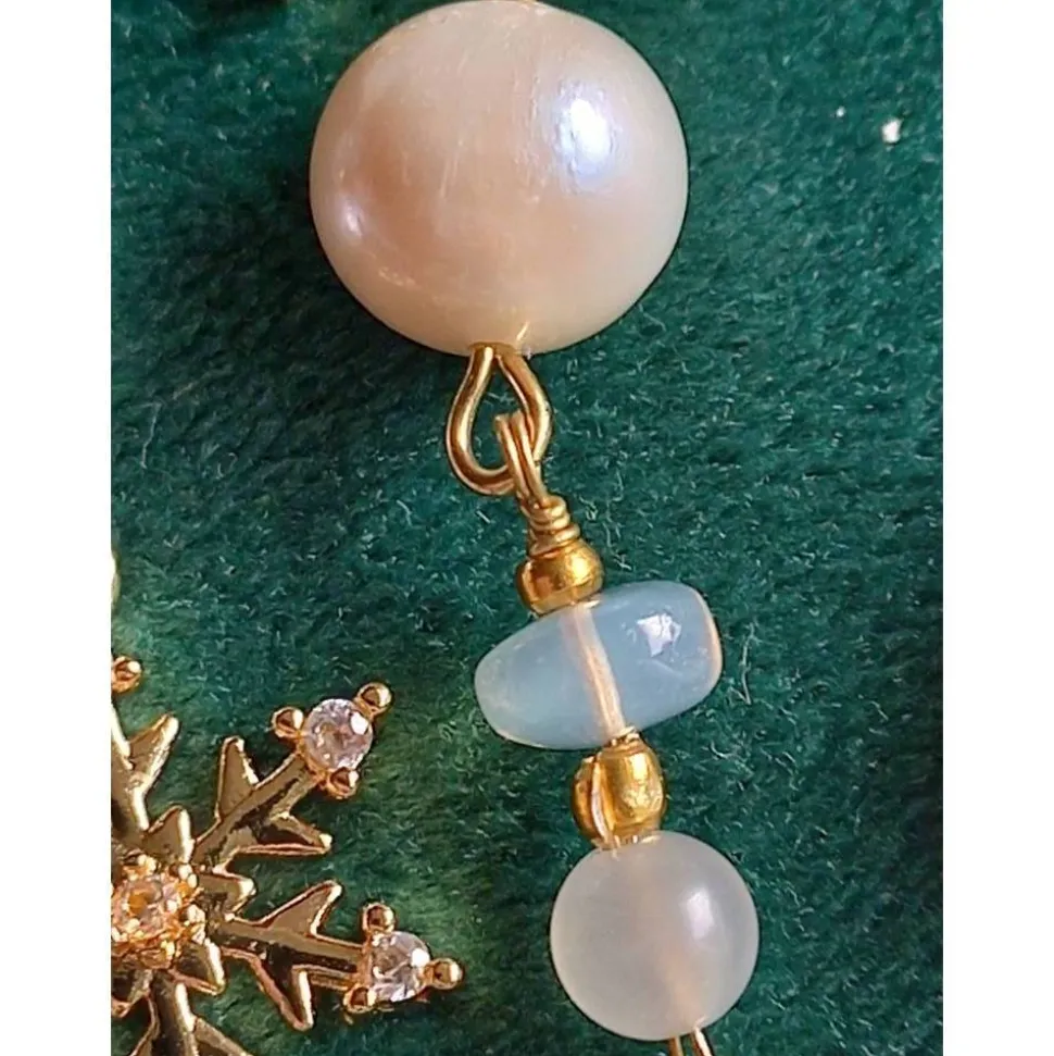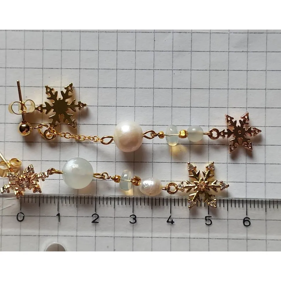 Leider gelingt es mir nicht wirklich, die tatsächliche Schönheit der Edelsteine, Perlen und der Schneeflocken-Anhänger auf den Fotos wieder zu geben und insbesondere den berühmten „Schimmer“ der Mondstein-Perlen (Adulareszenz) sowie das (leichte) Farbenspiel des Opals einzufangen. Lineal und andere Edelsteine sowie etwaige Dekorationsgegenstände dienen nur dem Größen- und Farbvergleich und sind nicht Bestandteil des Angebots. Auf Foto 8 ist einer der Ohrringe von der Vorder- und der zweite von der Rückseite zu sehen, 5 weitere Ohrring-Paare dieser Serie im direkten Vergleich auf Foto 9 und auf Foto 10 eine Auswahl silber-farbener Ohrring-Paare dieser Serie (jeweils in separaten Angeboten erhältlich).
