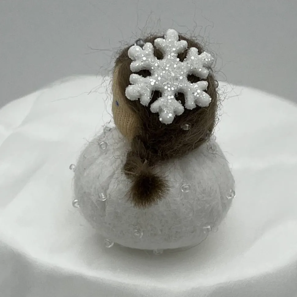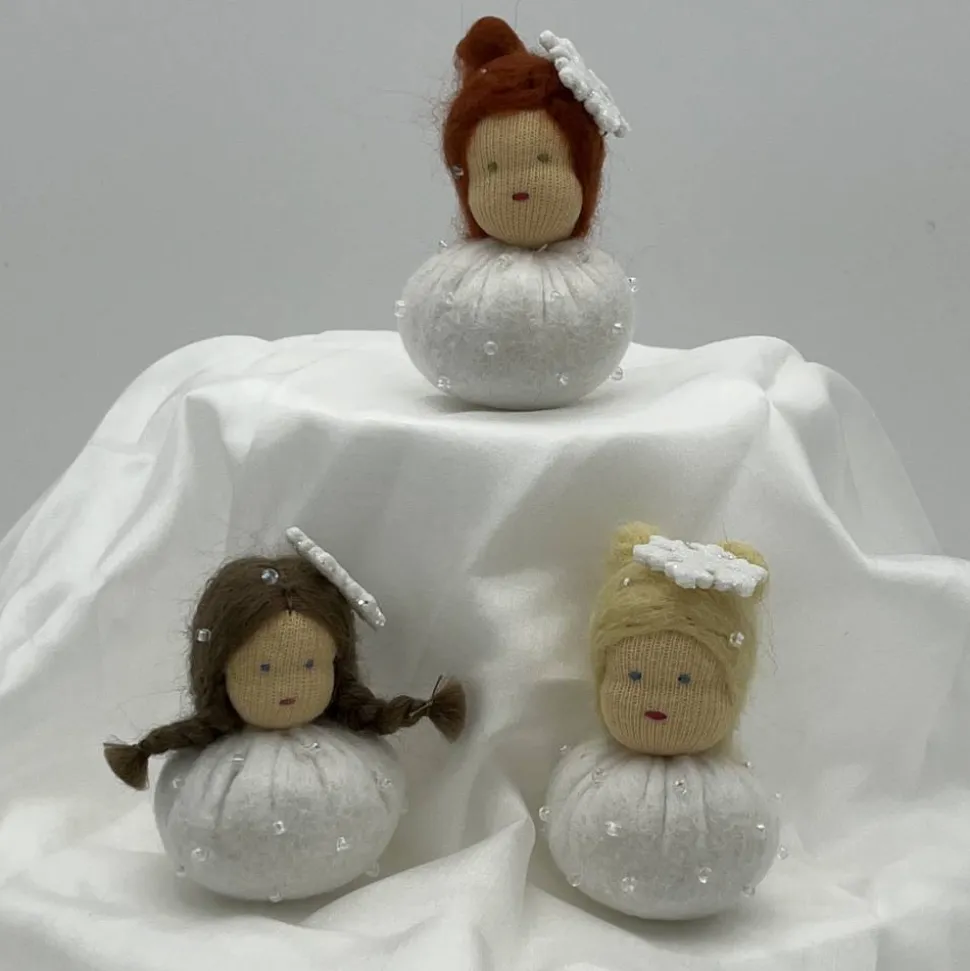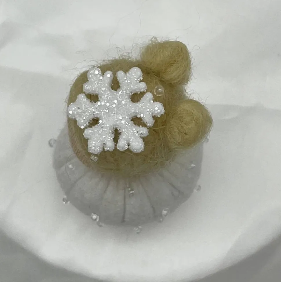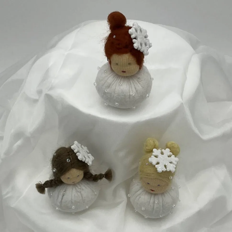 Sie sind ca. 6 cm groß. Sie sind mit Glitzerperlen bestickt und haben eine Glitzer Schneeflocke auf dem Kopf.