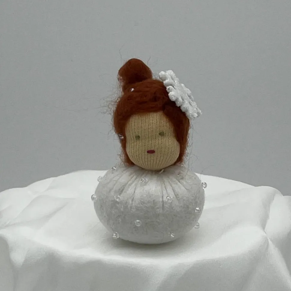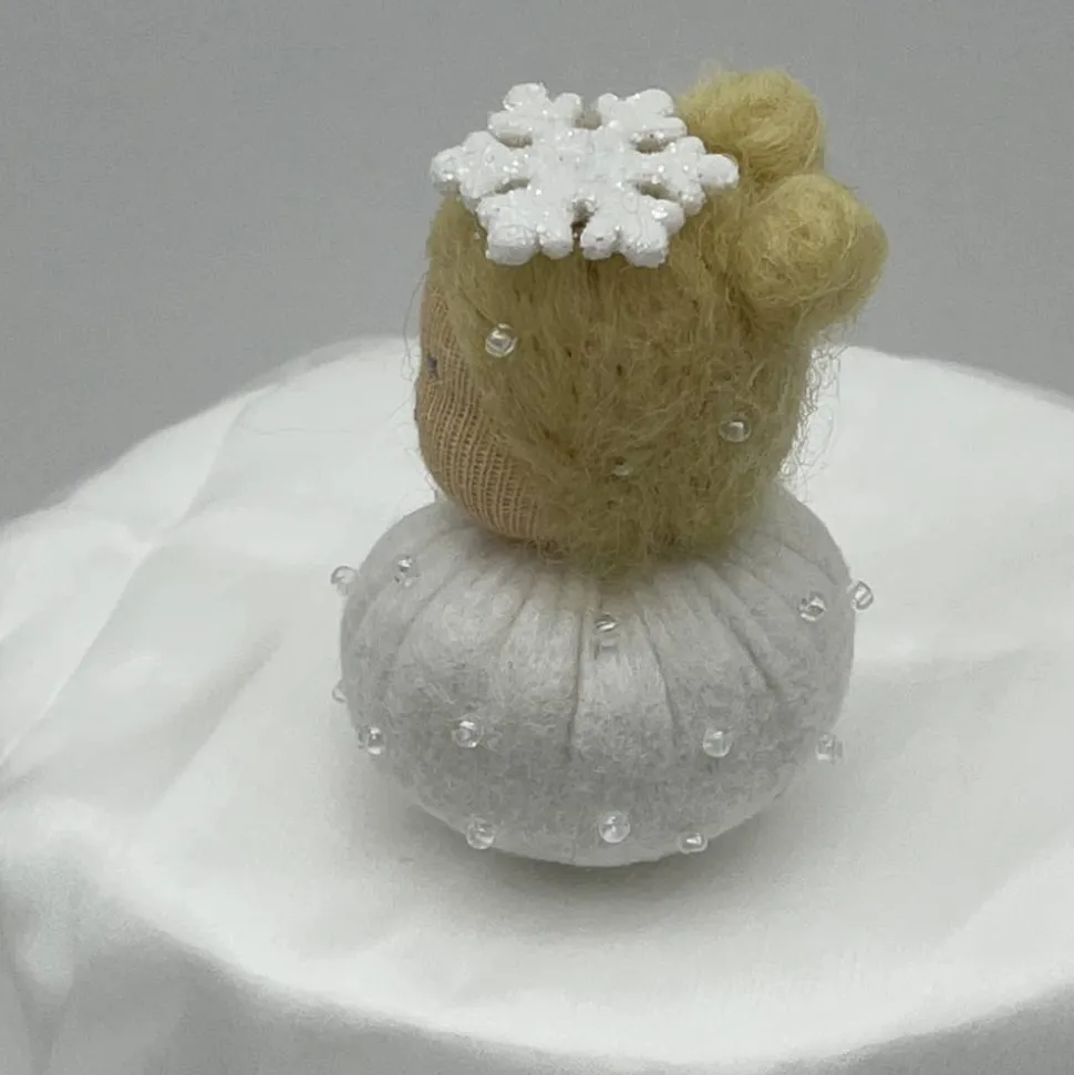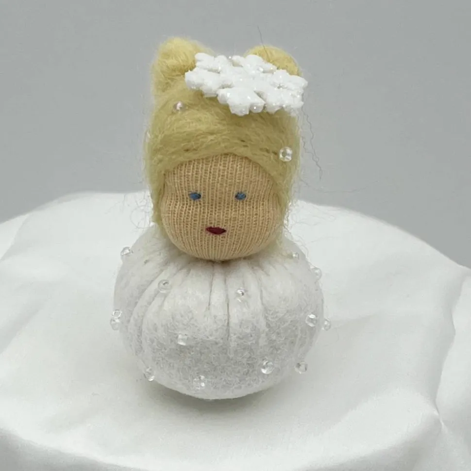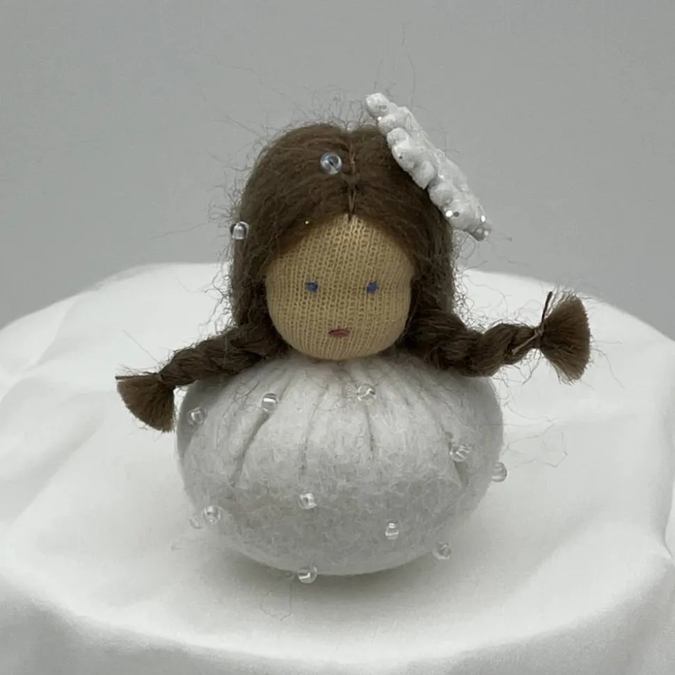 Sie sind ca. 6 cm groß. Sie sind mit Glitzerperlen bestickt und haben eine Glitzer Schneeflocke auf dem Kopf.