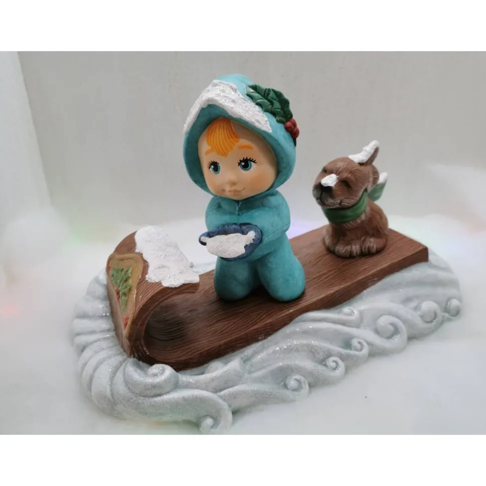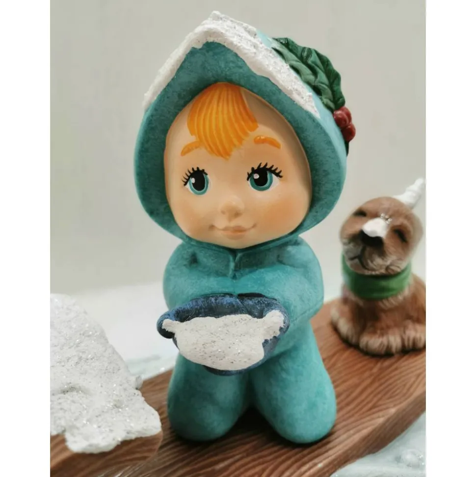 Das Schneekind kommt mit Schlitten und Hund, die Figuren sind aus Keramik, handgemalt und wetterfest versiegelt, können also auch draußen stehen, sollten aber vor Frost geschützt werden. Das Ganze ist ca 20x32cm.