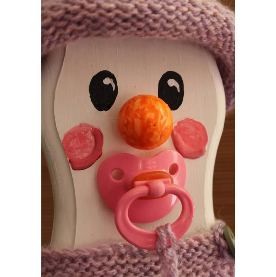 Lustige Schneemann-Figur aus grobem Holz mit Acrylfarben bemalt. Witzige Gestaltung mit handgestricktem Wollmützchen, Lätzchen und Schleife. Mit Füßchen aus Stoff, Mini-Fläschchen und Mini- Schnullern dekoriert.