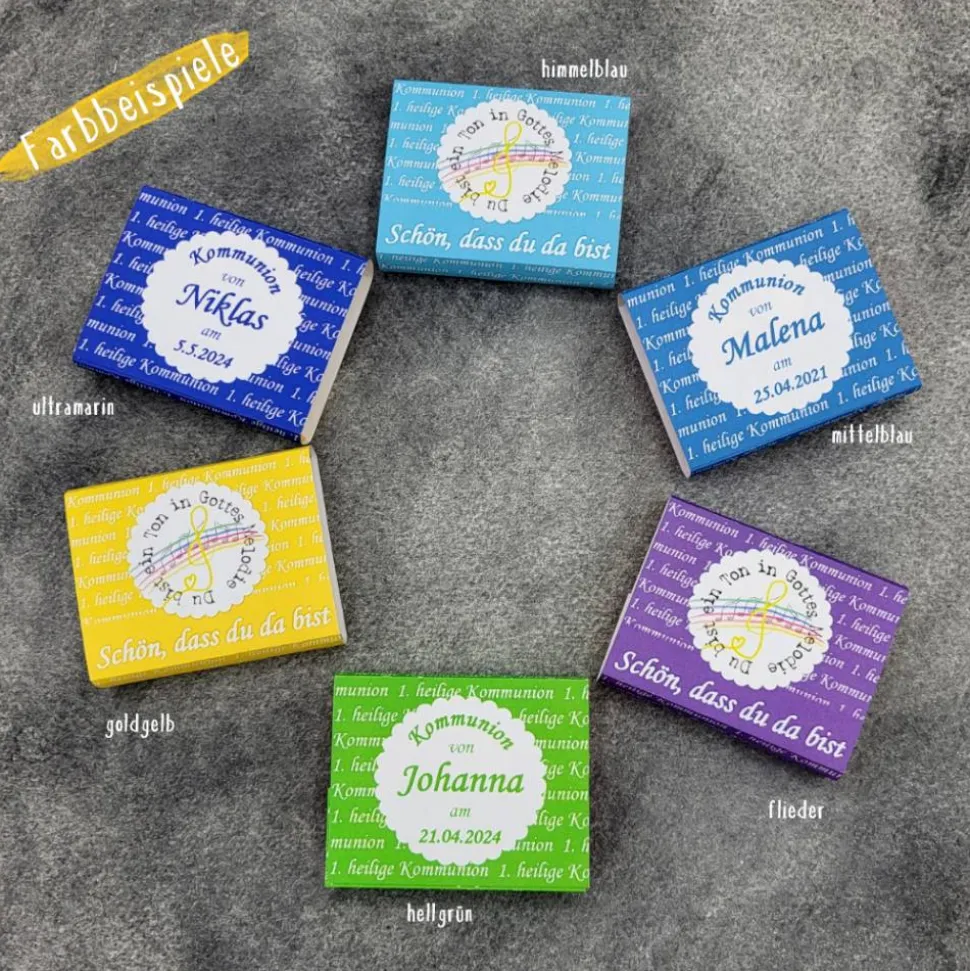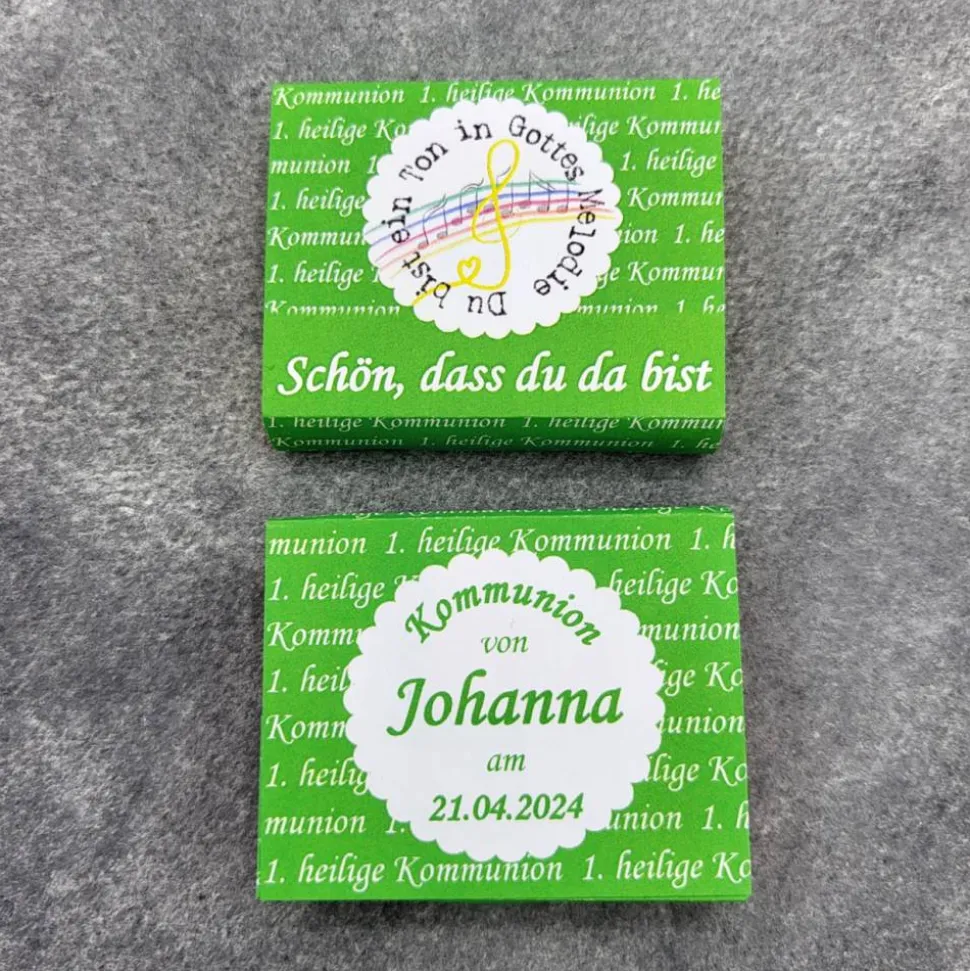 Gestalte deine Feier einzigartig mit einer individuell bedruckten Banderole für kleine quadratische Mini-Schokoladentafeln (R..sport). Diese stilvollen Banderolen eignen sich perfekt als kleines Gastgeschenk, festliche Dekoration für die Kommunionstafel oder für die persönliche Begrüßung deiner Gäste.