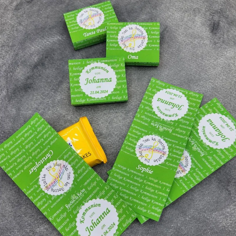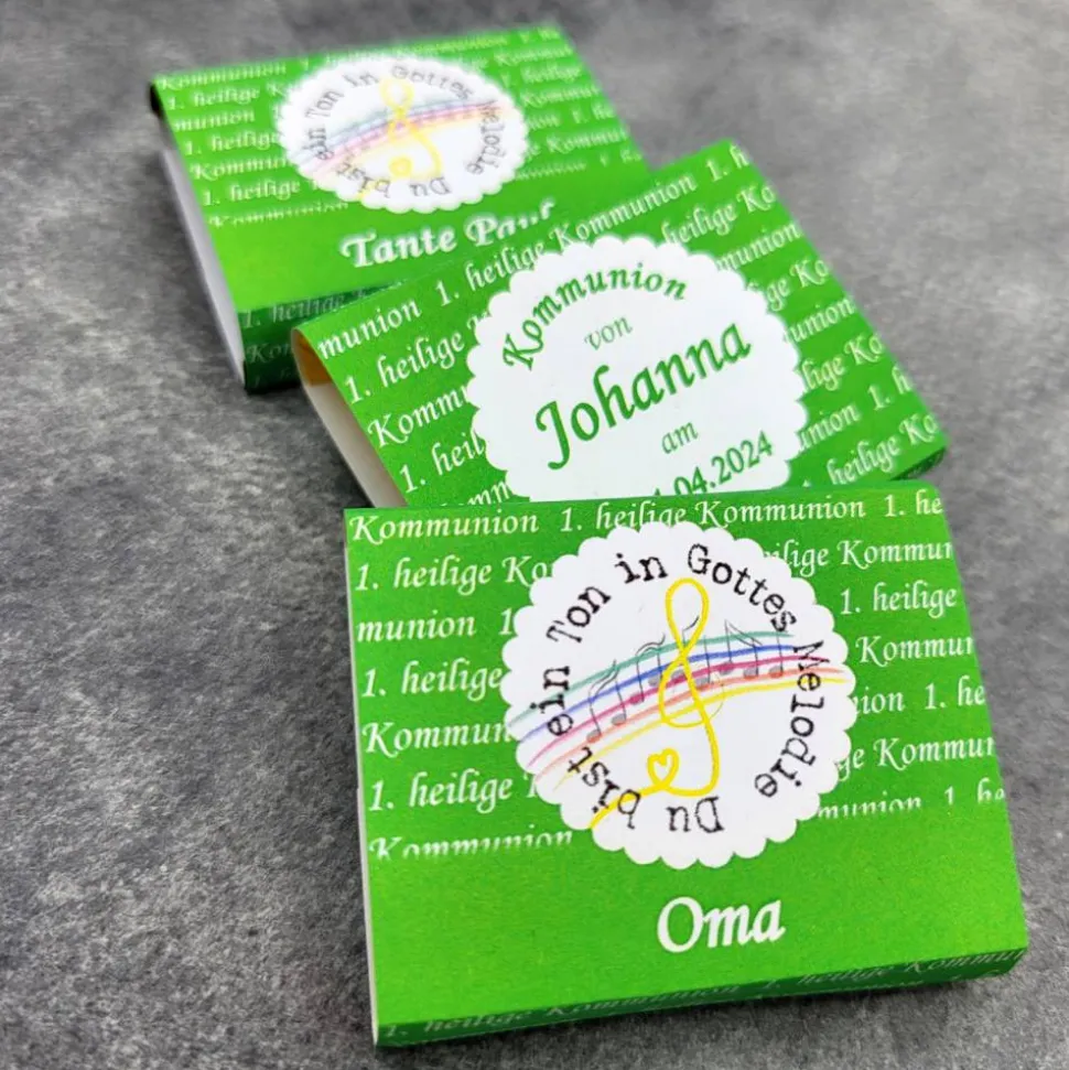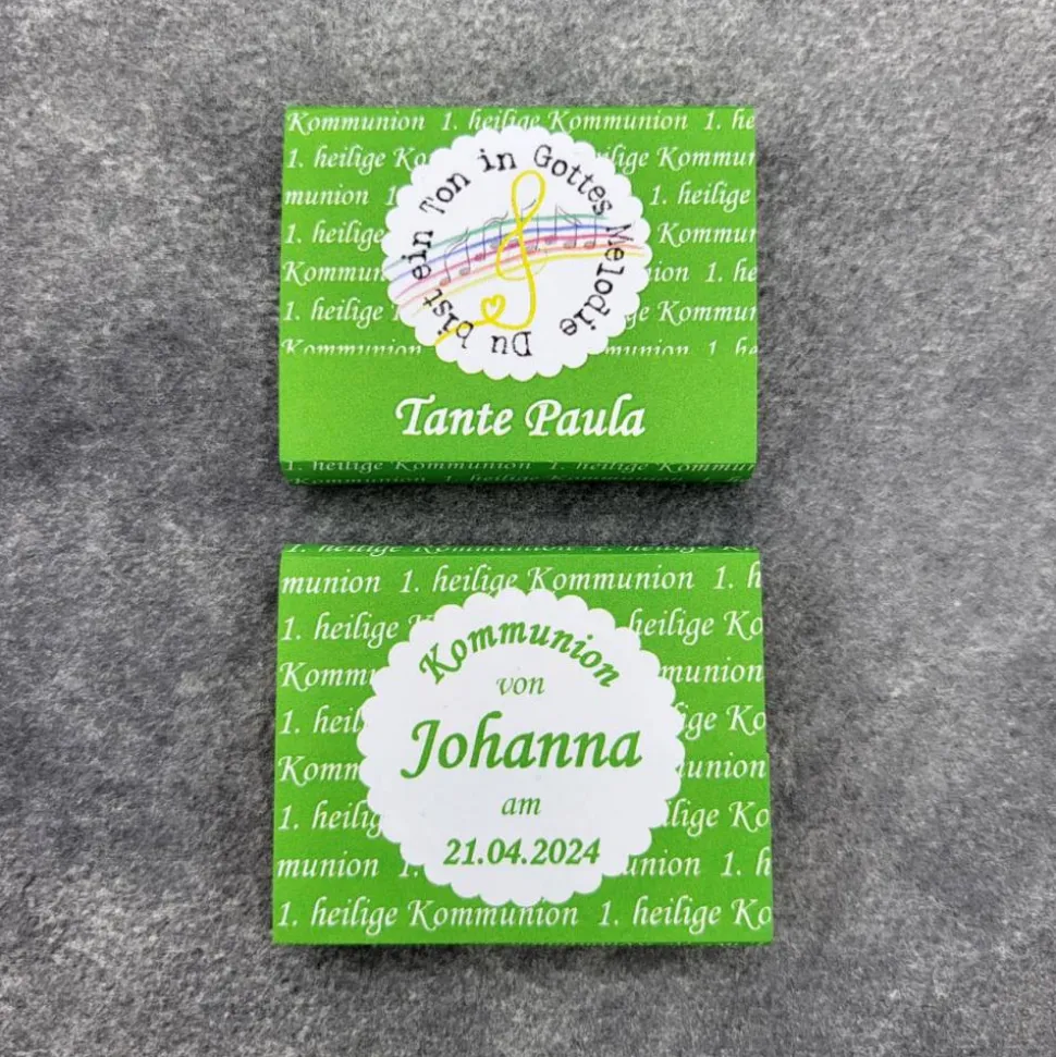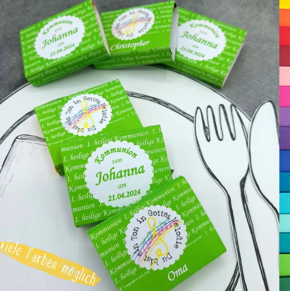 Das Motto „Du bist ein Ton in Gottes Melodie“ macht dieses Produkt zu etwas ganz Besonderem. Die Banderole wird individuell für dich angefertigt: Vorne steht der Name deines Gastes, auf der Rückseite werden der Name des Kommunionkindes und das Datum der Feier aufgedruckt.