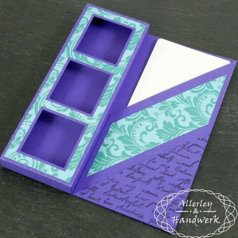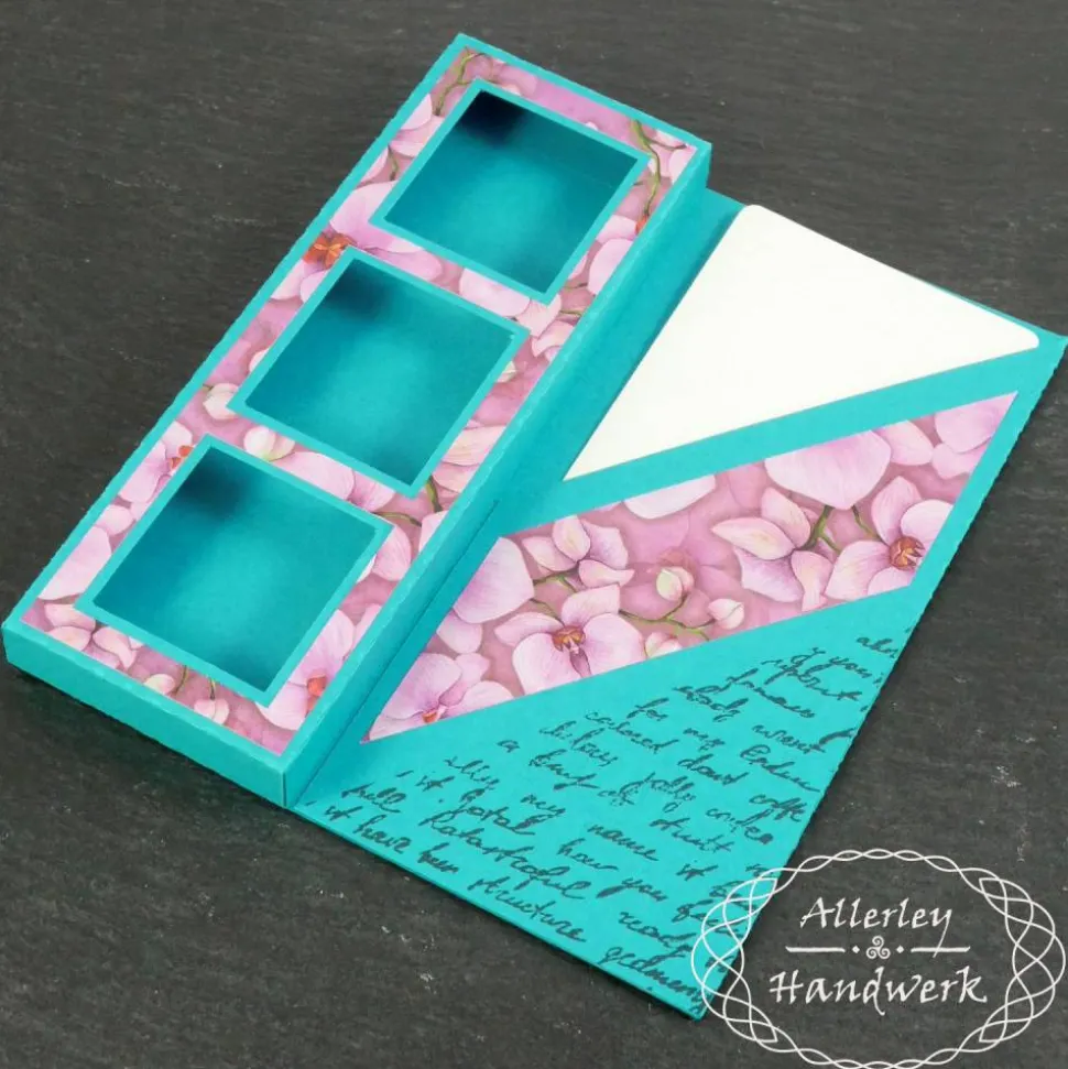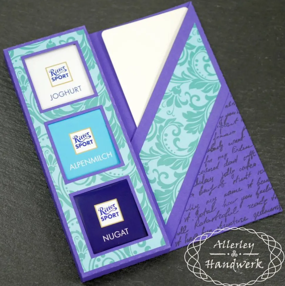 Im Fach ist Platz für drei Schokoladentafeln einer bekannten Schokoladenmarke im Miniformat oder natürlich anderweitige Dinge, die hineinpassen und nicht durch die Sichtfenster herausfallen können. Die bestempelte Ecke beinhaltet ein Einsteckfach für einen Geldschein und auf der herausnehmbaren Einsteckkarte ist Platz für persönliche Nachrichten oder Glückwünsche.