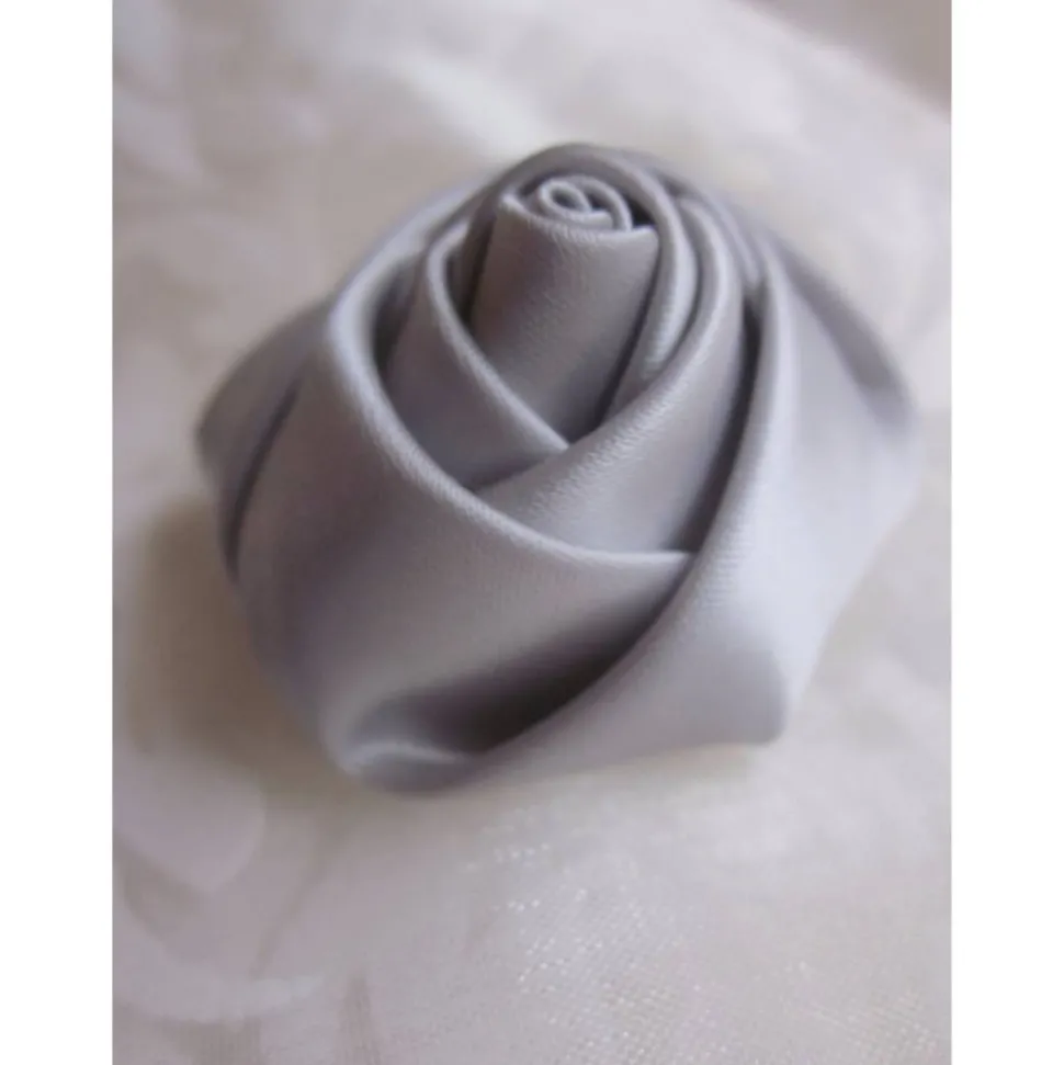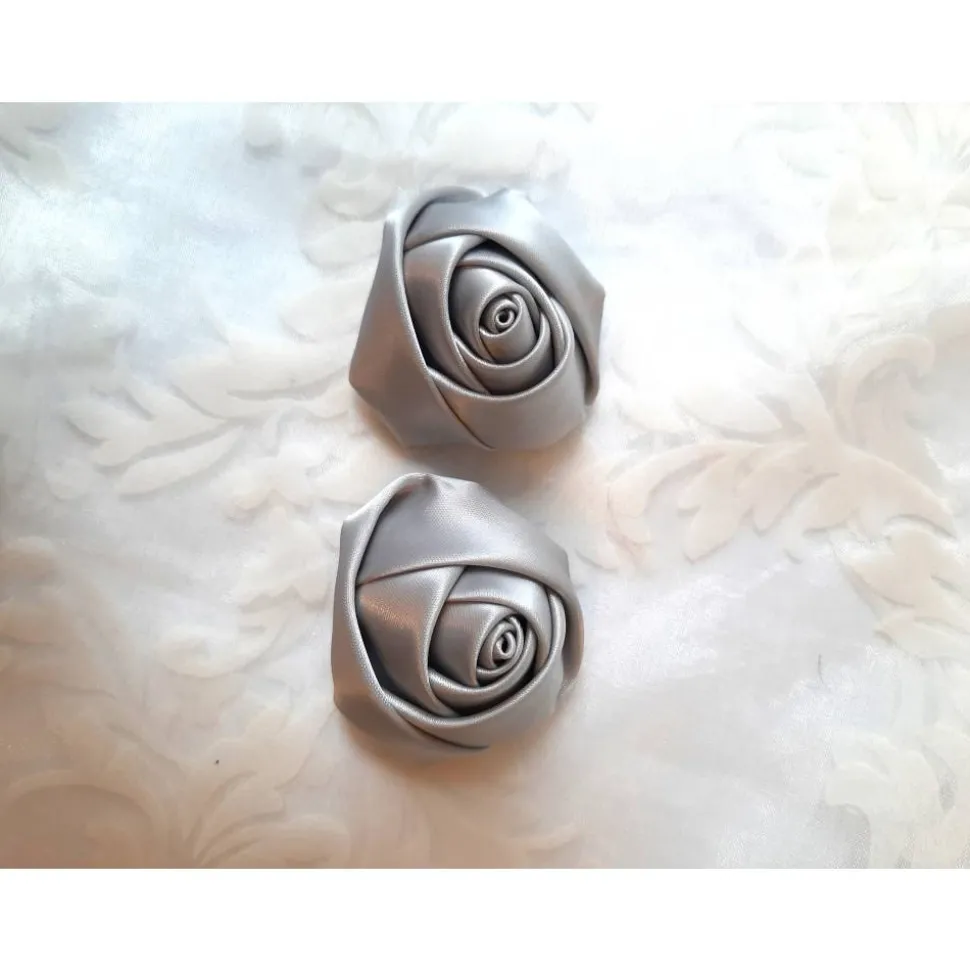 Zwei elegante Schuhclips in Form von Blüten aus hellgrauem, schimmerndem Satin.