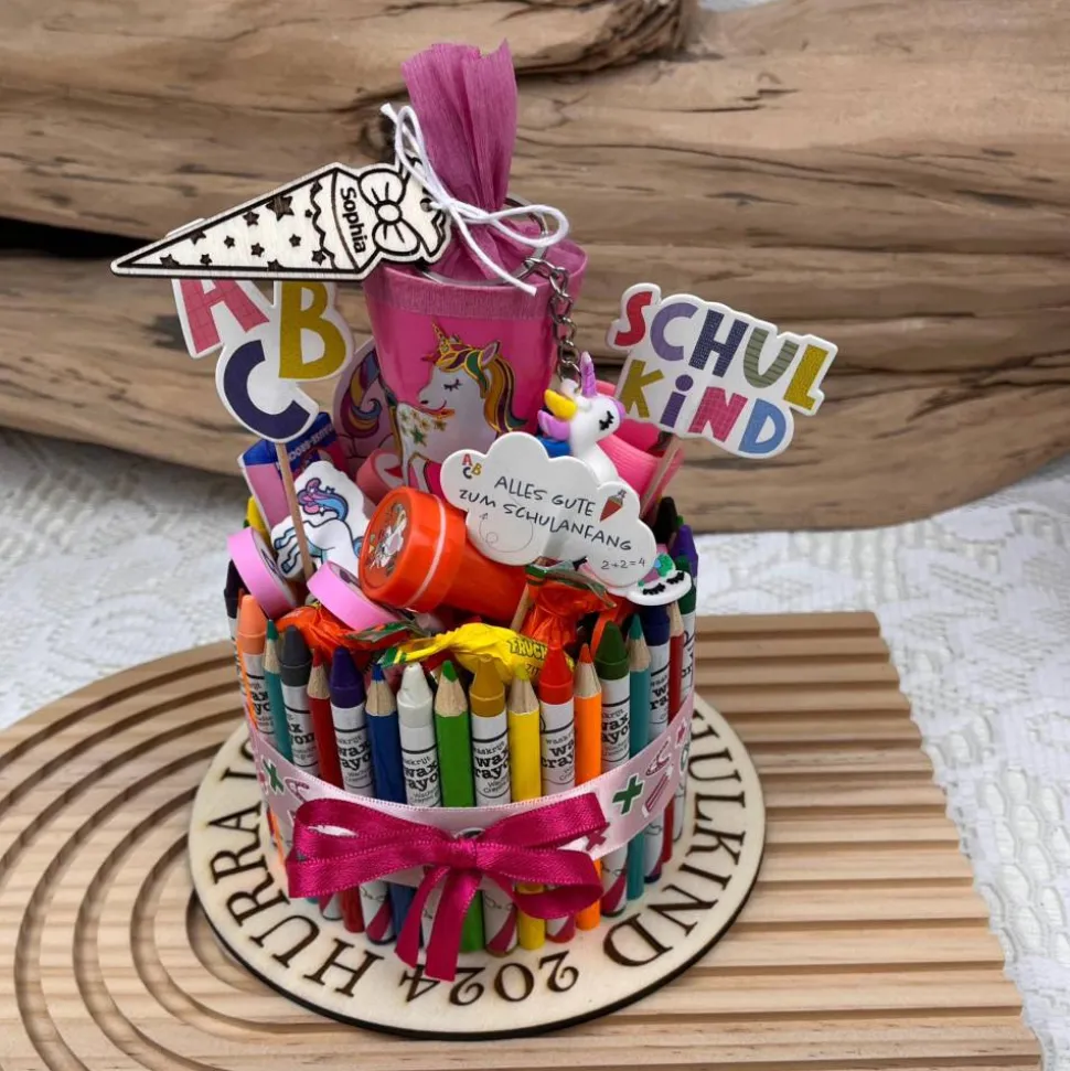 Diese dekorative und praktische Stiftetorte/Schultorte im Kleinformat ist das perfekte Geschenk oder Mitbringsel zur Schuleinführung. Ihr könnt diese Stiftetorten in vielen verschiedenen Mottos bestellen. Folgende Mottos können wir für euch umsetzen: