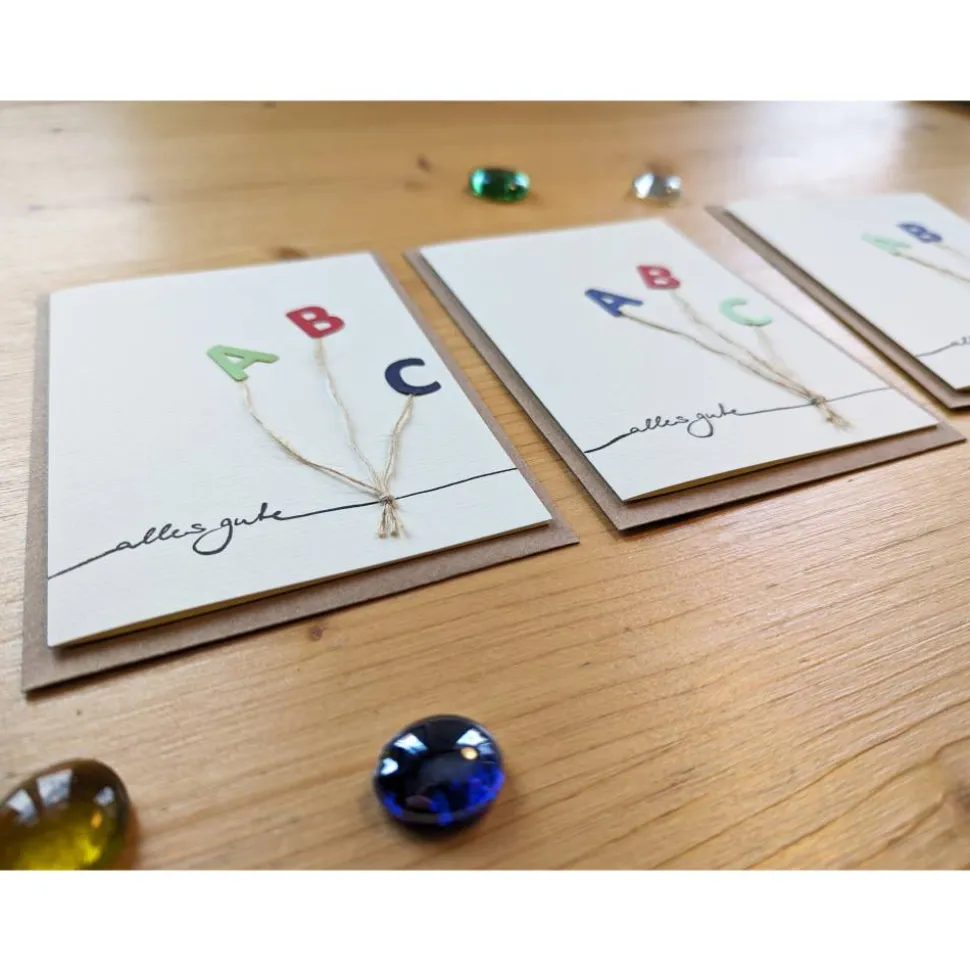 Jede Karte ist mit viel Liebe handgefertigt und unterscheidet sich leicht, u.a. in der Farbe und Position der Buchstaben. Die Auswahl erfolgt zufällig, Sie können aber ihre Wünsche für die Fähnchenfarben per Nachricht an mich senden.